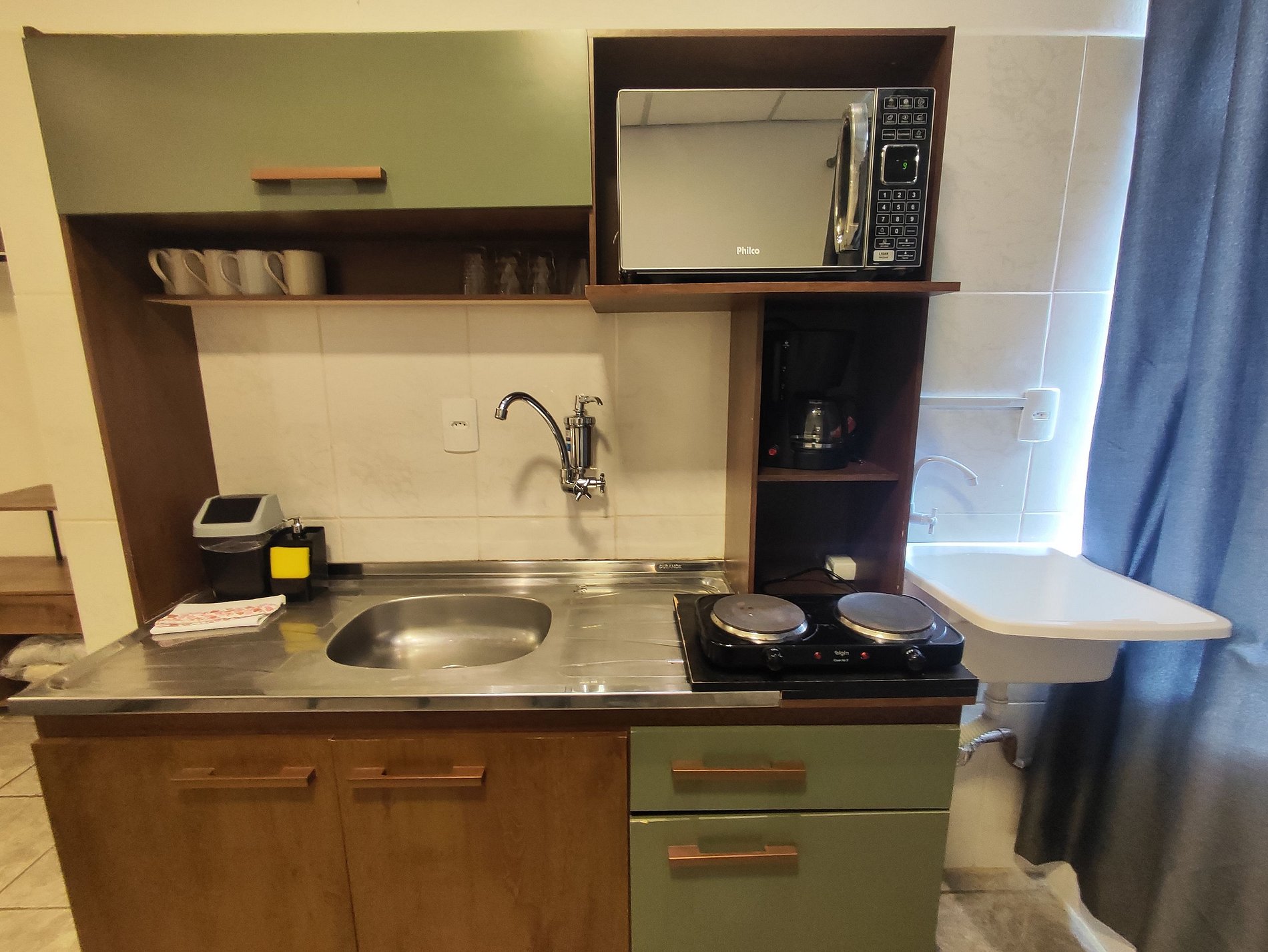 The Studio is approximately 25 m2 and is very well equipped for up to 3 people. It has a kitchen with an electric stove, microwave, refrigerator, coffee maker and other utensils to make your meals on site in peace. The Studio has Hot/Cold Air Conditioning. The bathroom is private and has bath and face towels, as well as complimentary 2-in-1 shampoo and soap. Access is via stairs. Located on a residential street, close to Vila Germânica and the center of Blumenau.