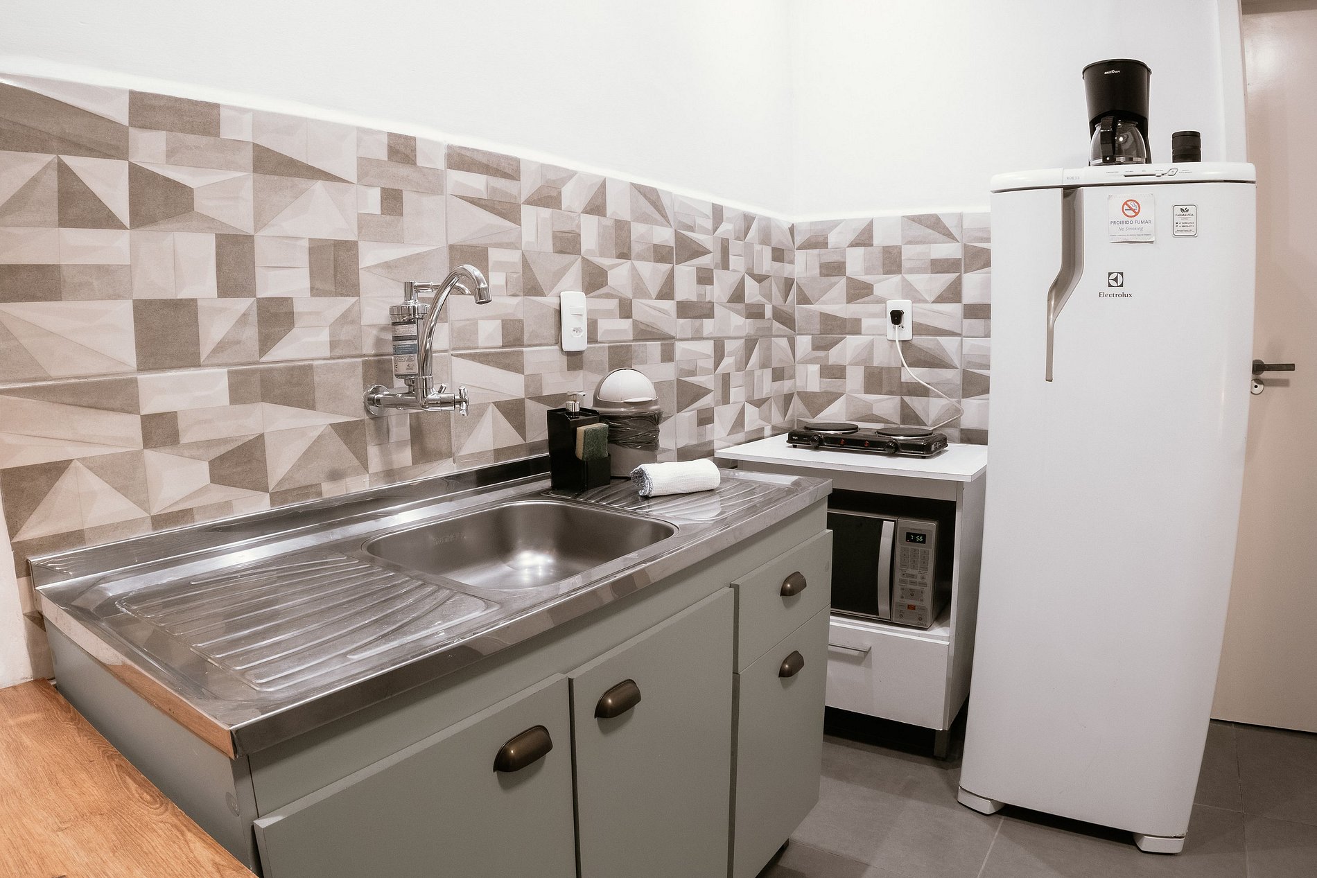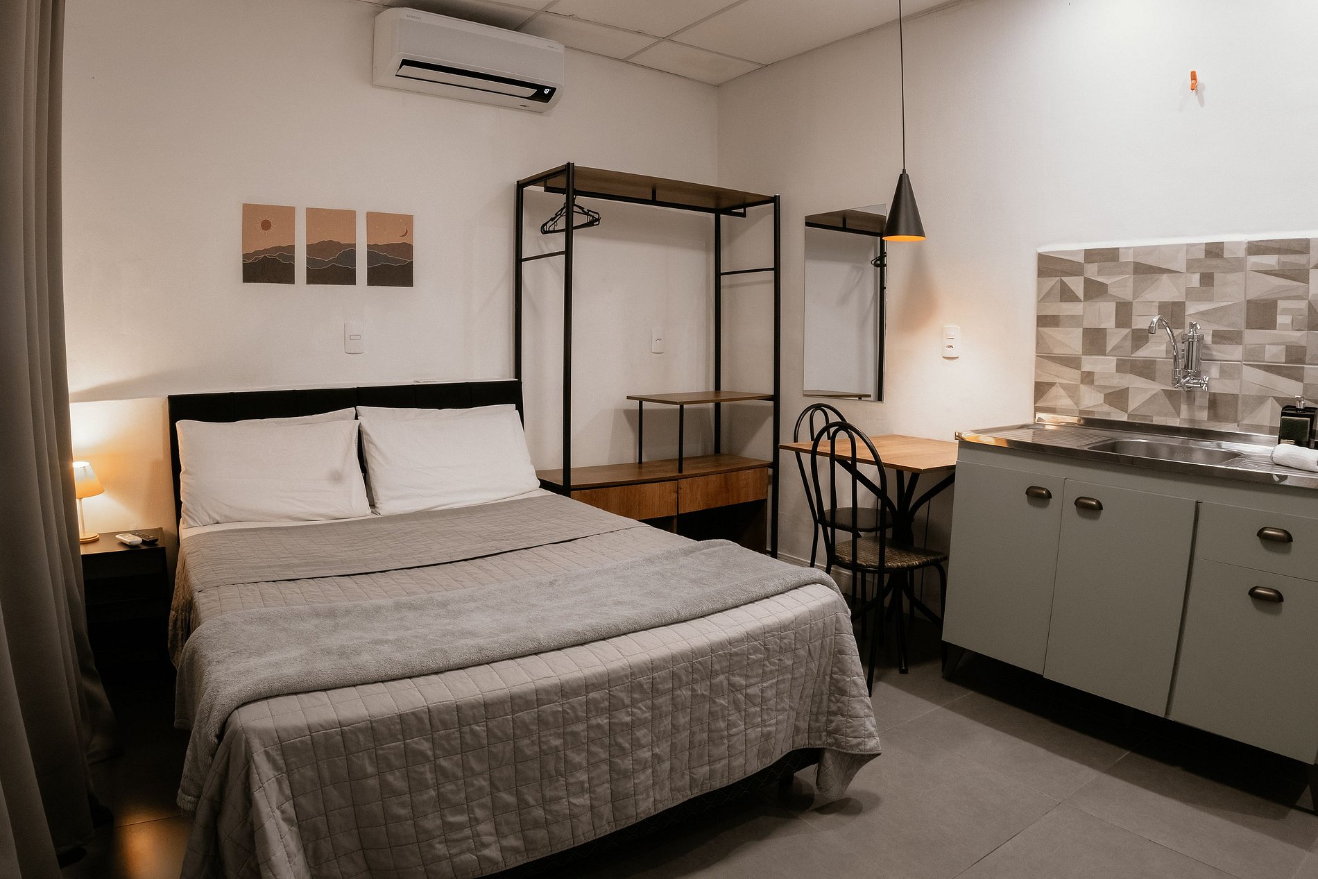A comfortable and thoughtfully designed space to offer a peaceful stay. Ideal for couples, small groups, or business travelers seeking practicality, comfort, and a great location. The studio: The Urban Studio is complete, cozy, and functional. It has a standard double bed, comfortably accommodating up to 2 people. The environment features hot and cold air conditioning, Wi-Fi, and a Smart TV with Fire TV Stick (access to streaming services such as Prime Video, Disney+, and YouTube), as well as a bedside table with a lamp and a closet-style wardrobe with hangers. The kitchen is equipped with an electric stove, microwave, refrigerator, coffee maker, and essential utensils for meal preparation. The space also offers complete bedding, including sheets, pillowcases, pillows, bedspread, and plush blanket. The bathroom is private and includes bath and face towels, as well as complimentary 2-in-1 shampoo and soaps. The studio is located on the ground floor (accessible by stairs) and has a shared laundry room with a washing machine, dryer, ironing board, and iron. Location: Located in the Velha neighborhood, in a quiet residential area, the studio is about 4 km from downtown Blumenau and approximately 2 km from Vila Germânica, where the city's main events take place, such as Oktoberfest, fairs, shows, and seasonal attractions. Nearby, you'll find a bakery, pharmacy, supermarket, and banks within a few minutes' walk. Guest Access: Check-in: 2 PM to 11 PM (please inform us of your arrival time in advance) Check-out: until 11 AM Other Notes: • Parties are not allowed • Smoking is prohibited inside the property • Only guests included in the reservation are allowed to stay • Free parking on site (spaces in front of the building and covered options on nearby land) • Reception available from 8 AM until after midnight, with on-site convenience store offering drinks, food and basic items • Pets are welcome (pet friendly) – free