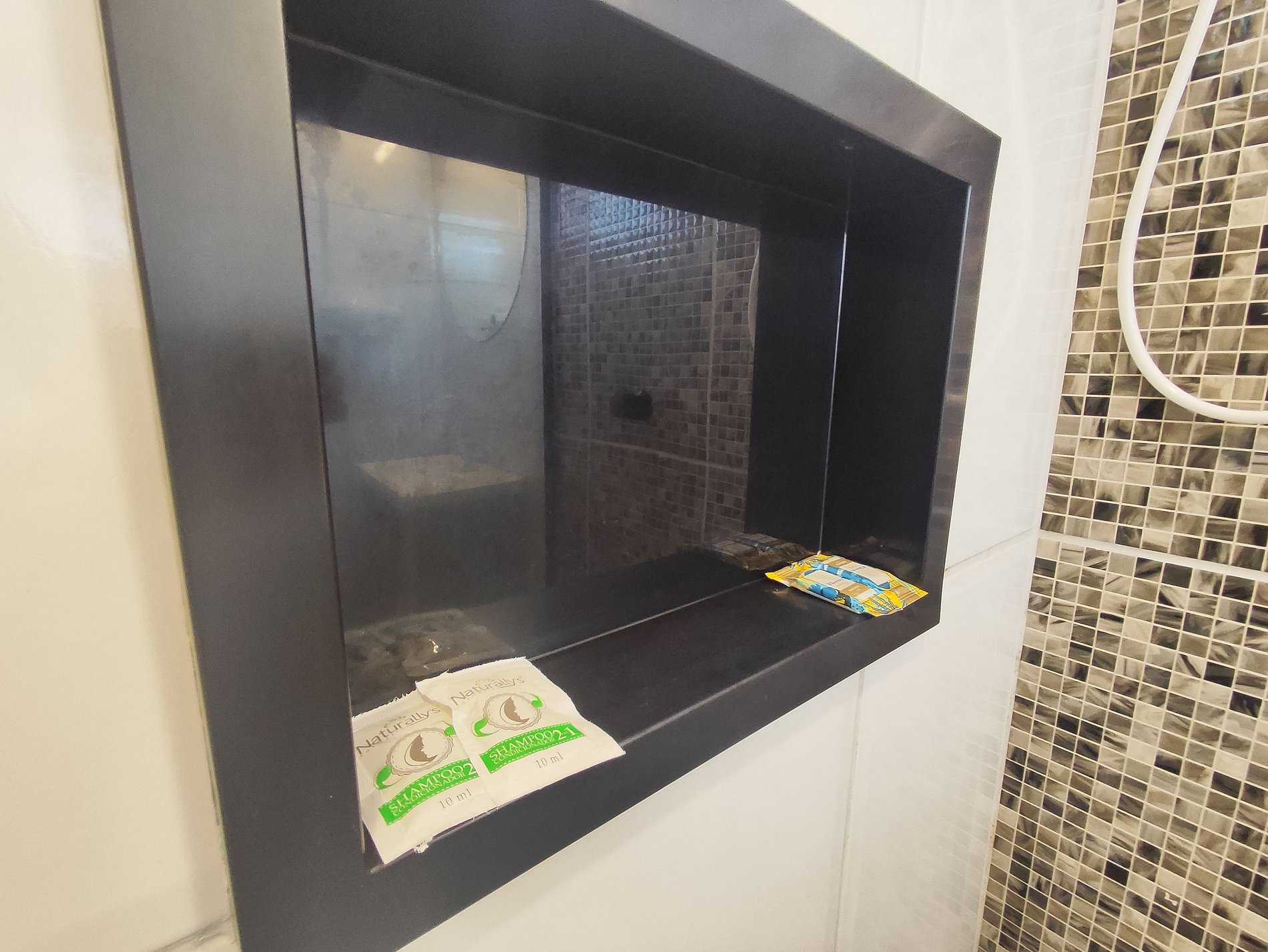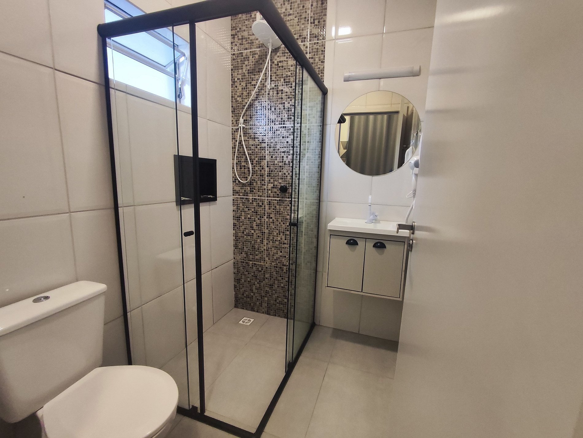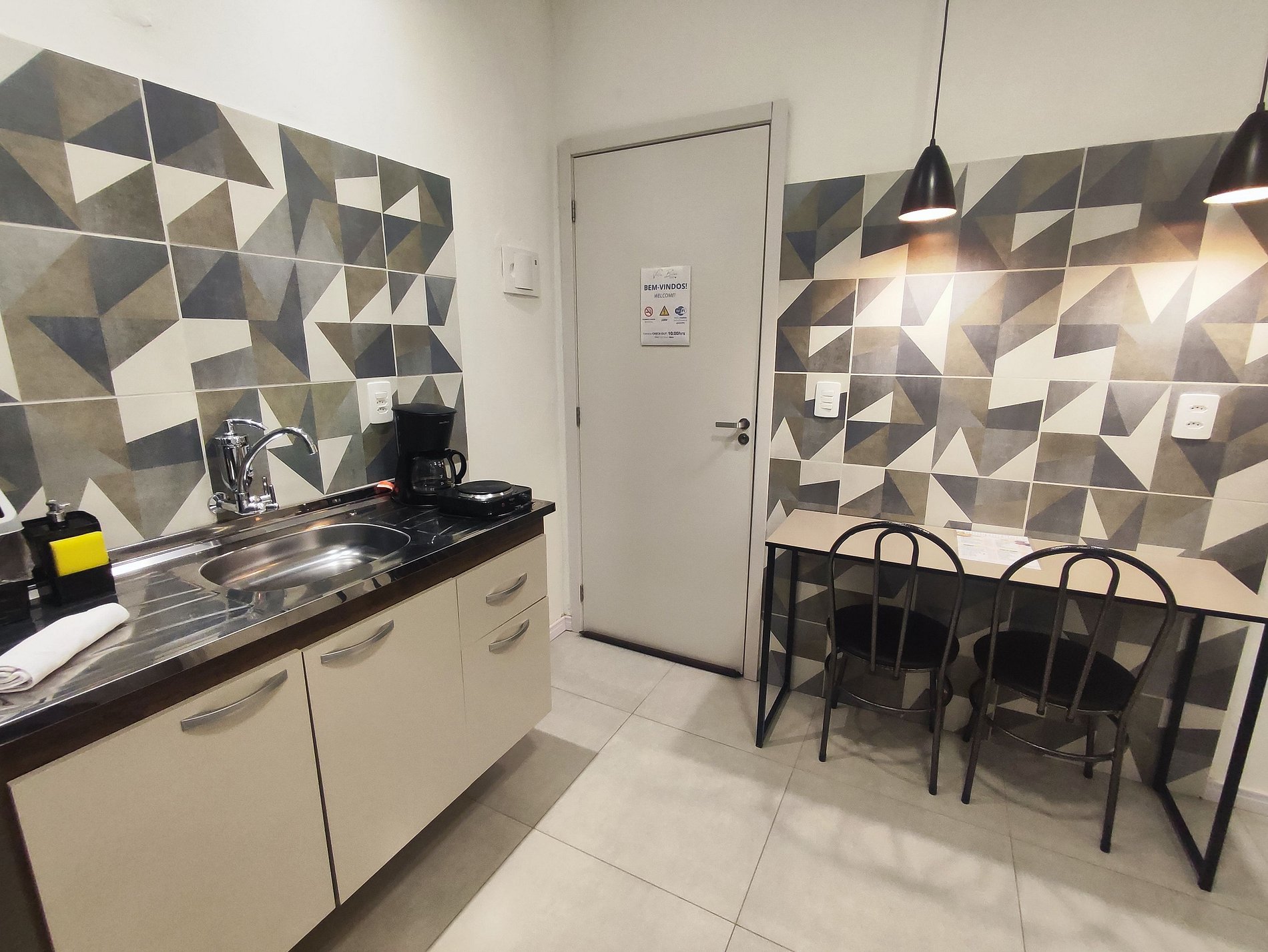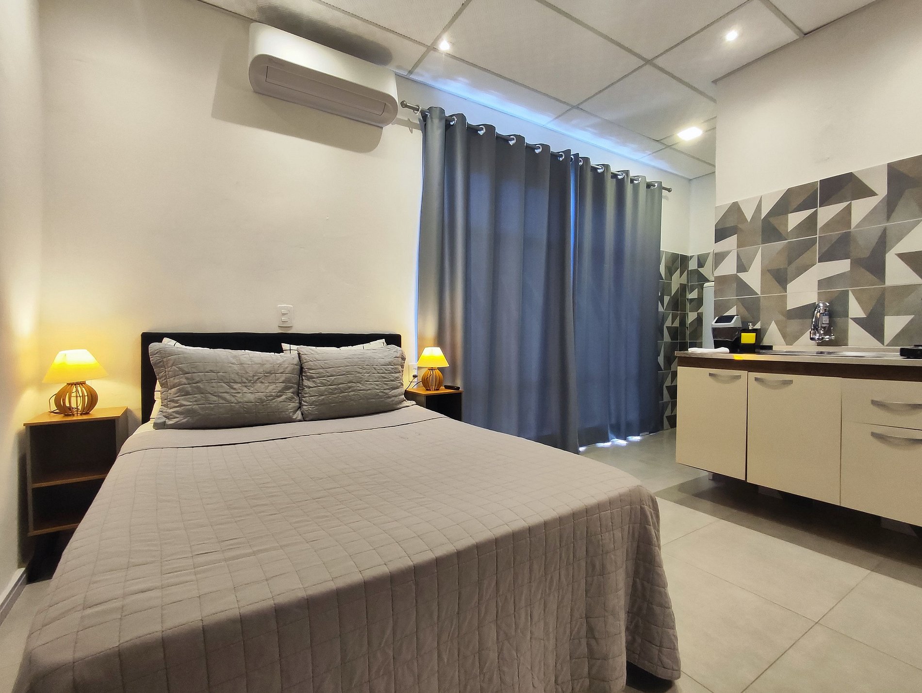 The Studio has in the bedroom a Standard Double Bed (138x188cm), bedside table with lamp, Air Conditioning 12000 BTUs (cold), closet with hangers. The TV has a Fire Tv Stick that allows access to streaming services (Disney, Prime Video, etc) and apps like Youtube. For your comfort, the room also has a sheet, pillowcase, pillows, bed cover and plush blanket.