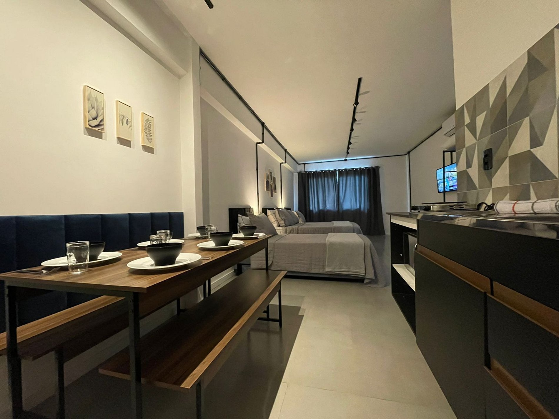 The Industrial Studio has in the bedroom a Standard Double Bed (138x188cm) and two single box showers (88x188cm) with an auxiliary bed (77x171cm), bedside tables with lamps, Air Conditioning 18000 BTUs (hot/cold), desk, closet with hangers . The TV has a Fire Tv Stick that allows access to streaming services (Disney, Prime Video, etc) and apps like Youtube. For your comfort, the room also has a sheet, pillowcase, pillows, bed cover and plush blanket.