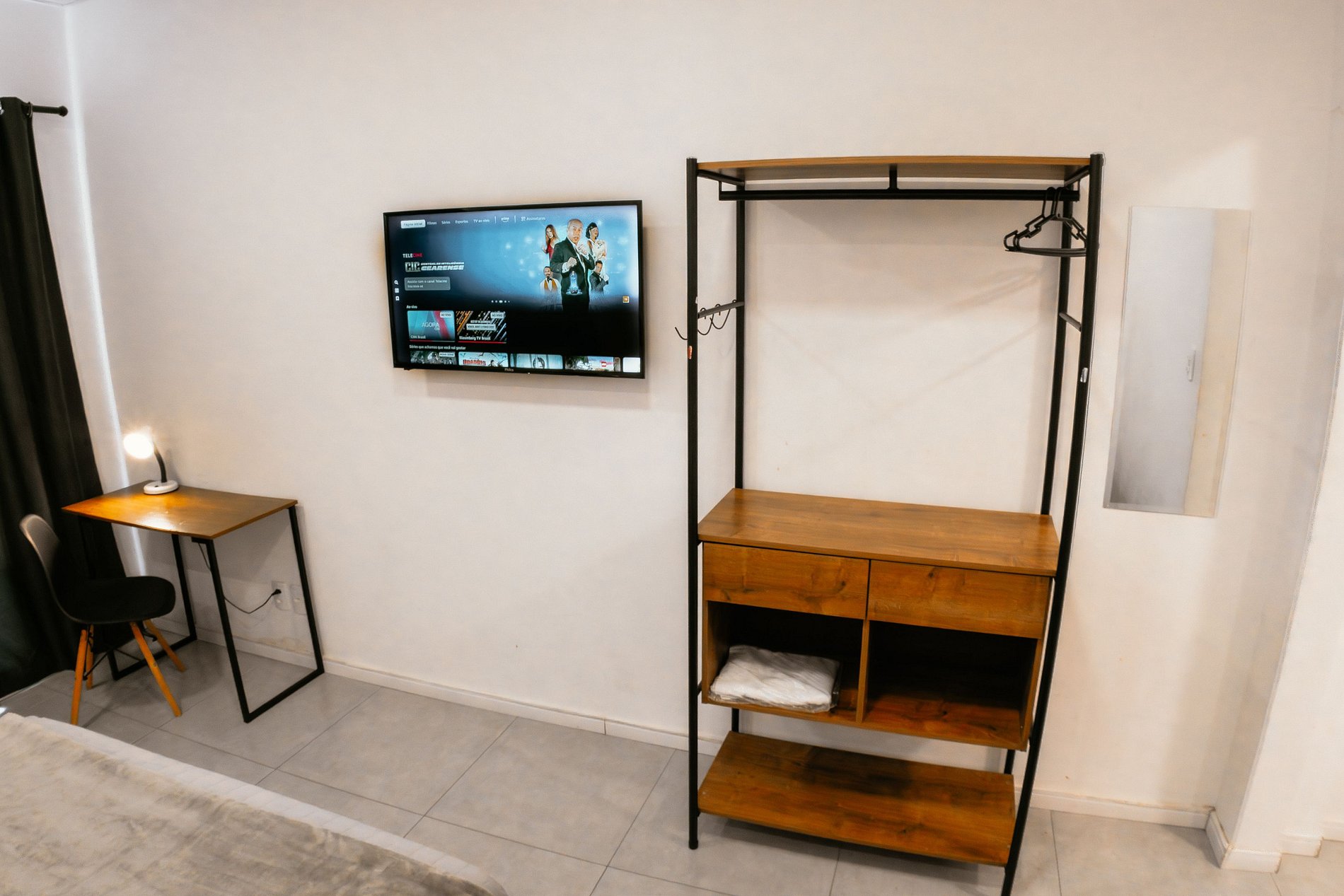 The studio is fully equipped, cozy, and functional. It has a standard double bed and two single box beds, comfortably accommodating up to 4 people. The room features hot and cold air conditioning, Wi-Fi, a Smart TV with Fire TV Stick (access to streaming services such as Prime Video, Disney+, and YouTube), as well as bedside tables with lamps and a closet-style wardrobe with hangers.