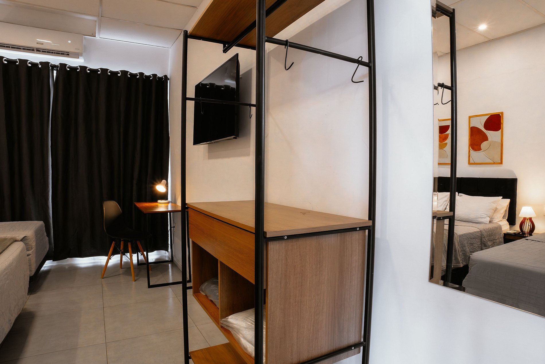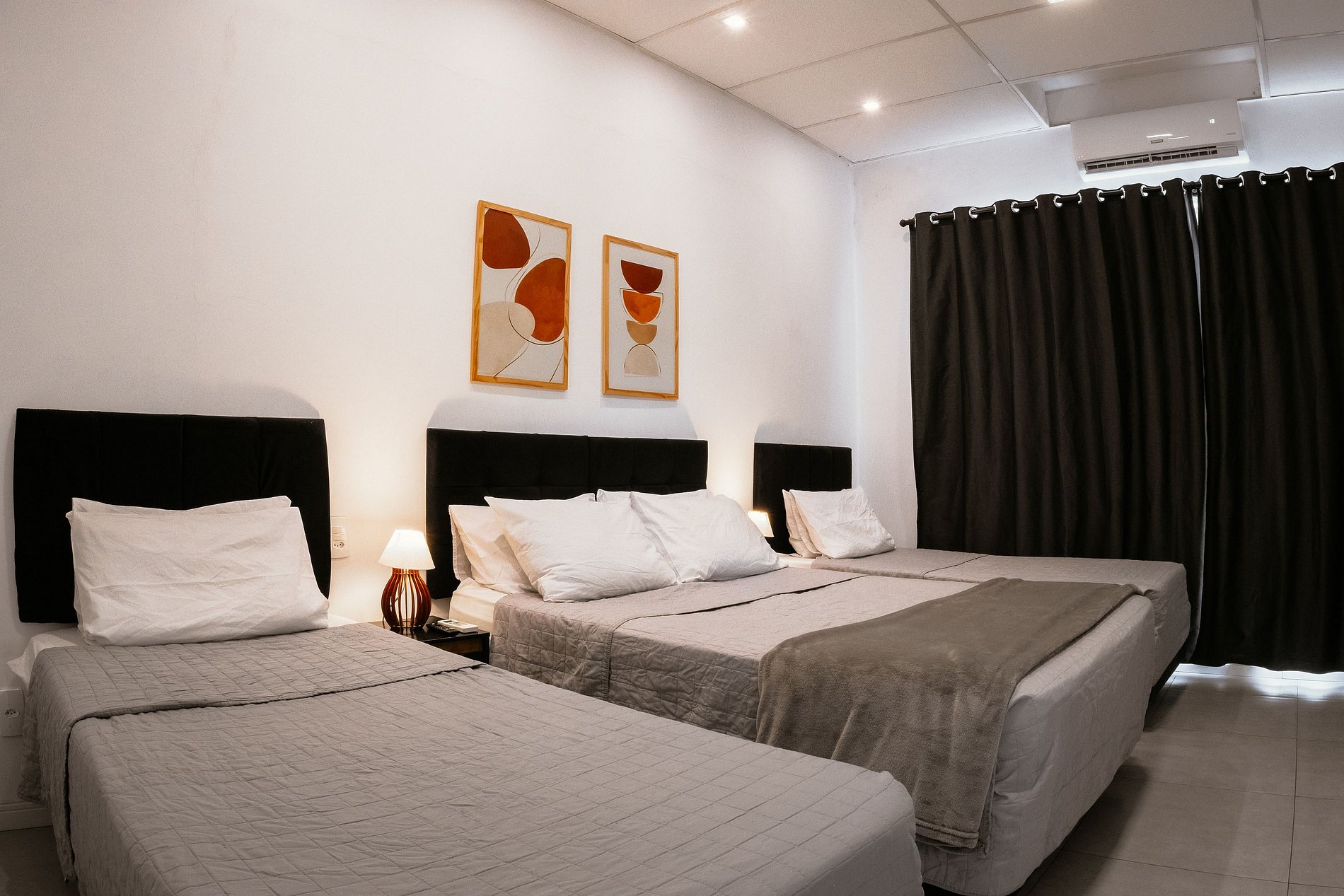 The Studio has in the bedroom a Standard Double Bed (138x188cm) and two single beds (88x188cm), bedside tables with lamps, Air Conditioning 18000 BTUs (cold/hot), closet-style cabinet with hangers. The TV has a Fire TV Stick that allows access to streaming services (Disney, Prime Video, etc.) and applications such as YouTube. For your comfort, the room also has sheets, pillowcases, pillows, bed covers and plush blankets.