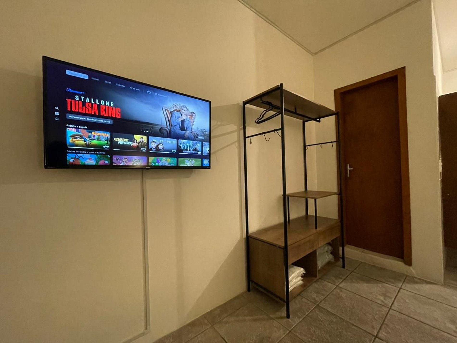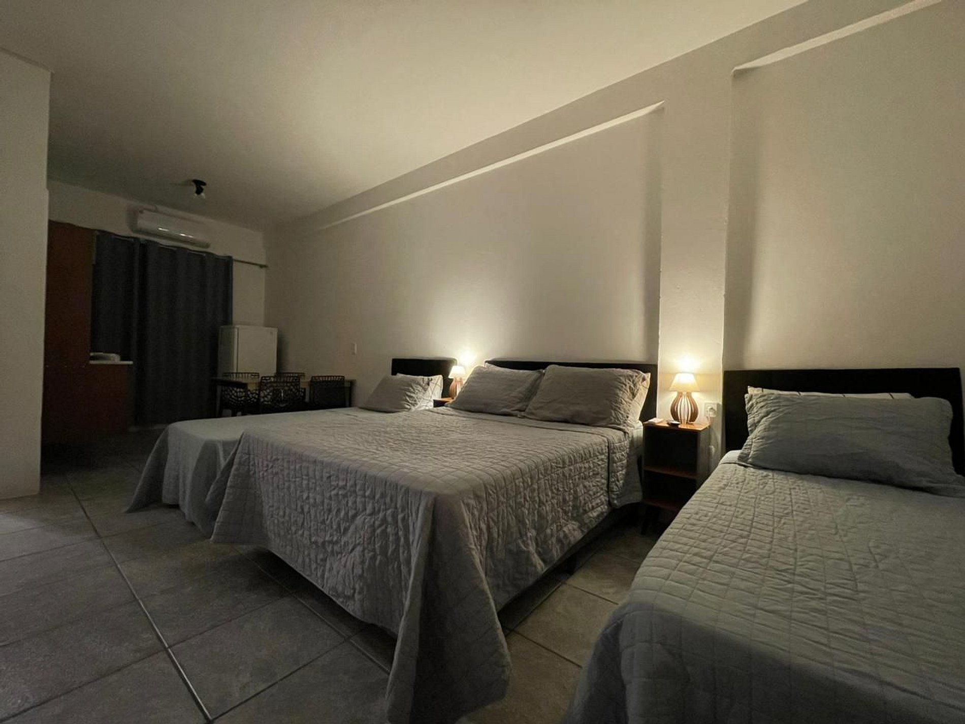 O Studio possui no quarto uma Cama Casal Padrão (138x188cm) e duas camas box solteiro (0,88x1,88), mesa de cabeceira com abajur. A TV permite acesso a serviços de streaming (Disney, Prime Video, etc) e aplicativos como o Youtube. Para seu conforto, o quarto ainda dispõe de lençol, fronha, travesseiros, cobre leito e manta plush. Possui Ar-Condicionado Quente/Frio.