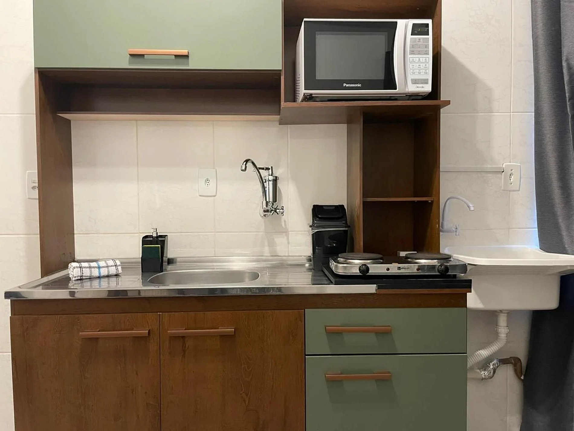 A cozinha conta com fogão elétrico, microondas, geladeira e demais utensílios para fazer suas refeições no local com tranquilidade. O banheiro é privativo e dispõe de toalhas de banho e rosto, bem como shampoo 2 em 1 e sabonetes como cortesia.