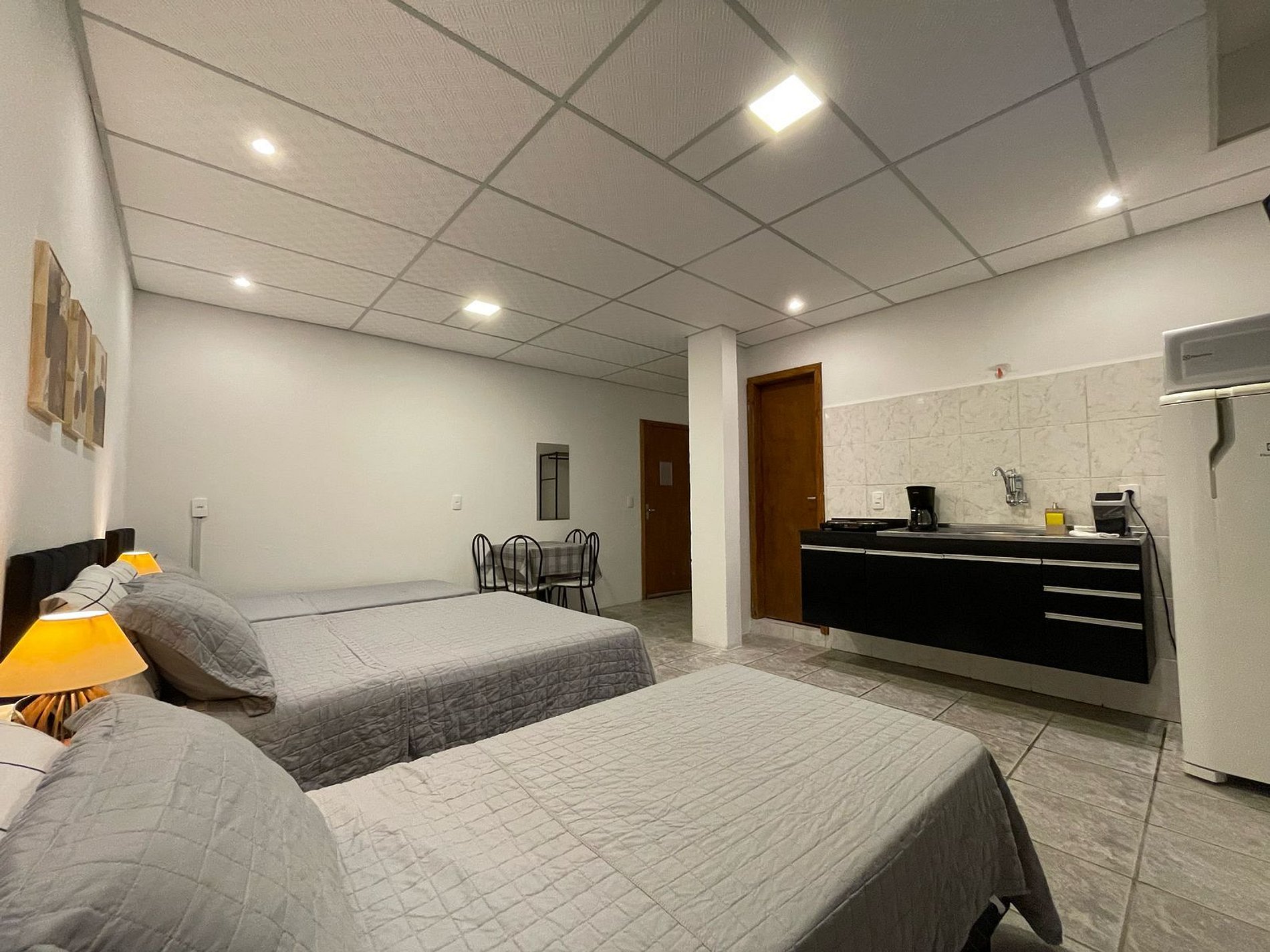 O Studio possui no quarto uma Cama Casal Padrão (138x188cm) e duas camas box solteiro (0,88x1,88), mesa de cabeceira com abajur. A TV permite acesso a serviços de streaming (Disney, Prime Video, etc) e aplicativos como o Youtube. Para seu conforto, o quarto ainda dispõe de lençol, fronha, travesseiros, cobre leito e manta plush. Possui Ar-Condicionado Quente/Frio.