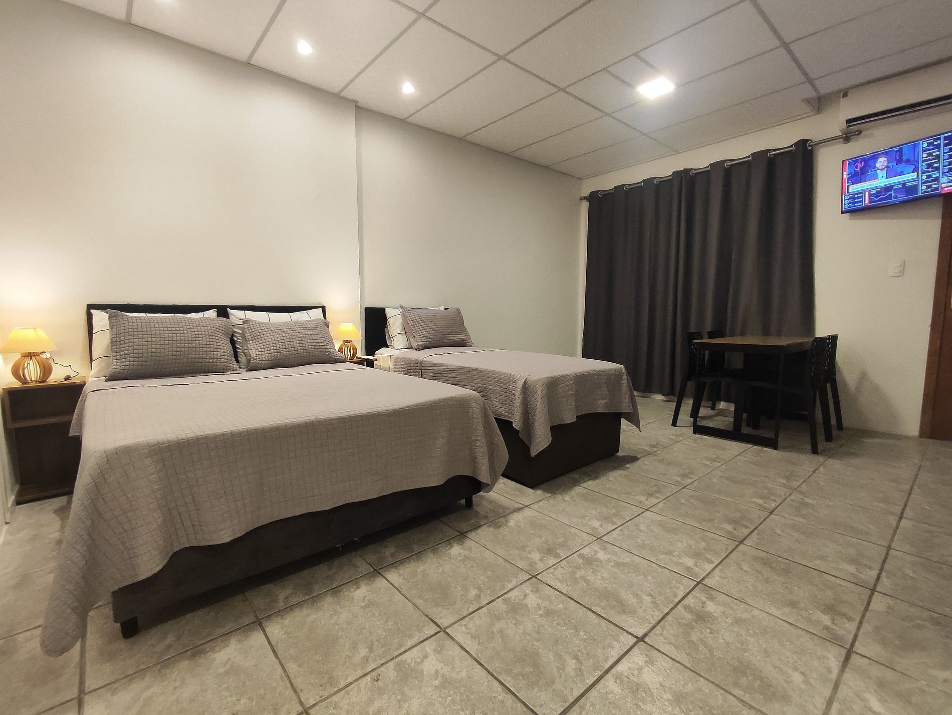O Studio possui no quarto uma Cama Casal Padrão (138x188cm) e uma bicama box solteiro que se abre conforme a necessidade de uso (medida colchão principal 0,88x1,88), mesa de cabeceira com abajur. A TV permite acesso a serviços de streaming (Disney, Prime Video, etc) e aplicativos como o Youtube. Para seu conforto, o quarto ainda dispõe de lençol, fronha, travesseiros, cobre leito e manta plush. Possui Ar-Condicionado Quente/Frio.