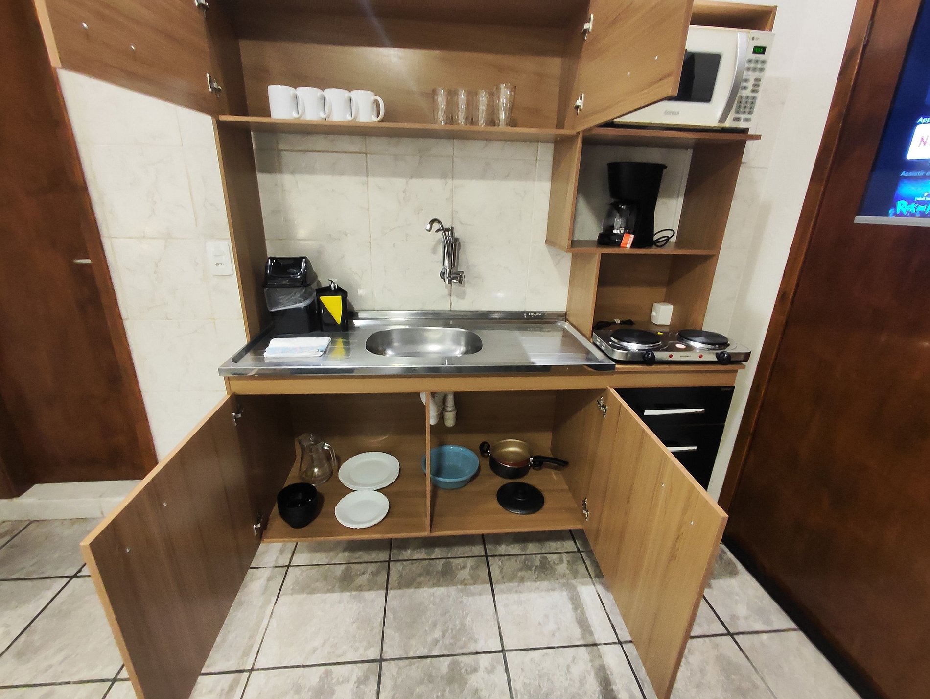 A cozinha conta com fogão elétrico, microondas, geladeira e demais utensílios para fazer suas refeições no local com tranquilidade. O banheiro é privativo e dispõe de toalhas de banho e rosto, bem como shampoo 2 em 1 e sabonetes como cortesia.