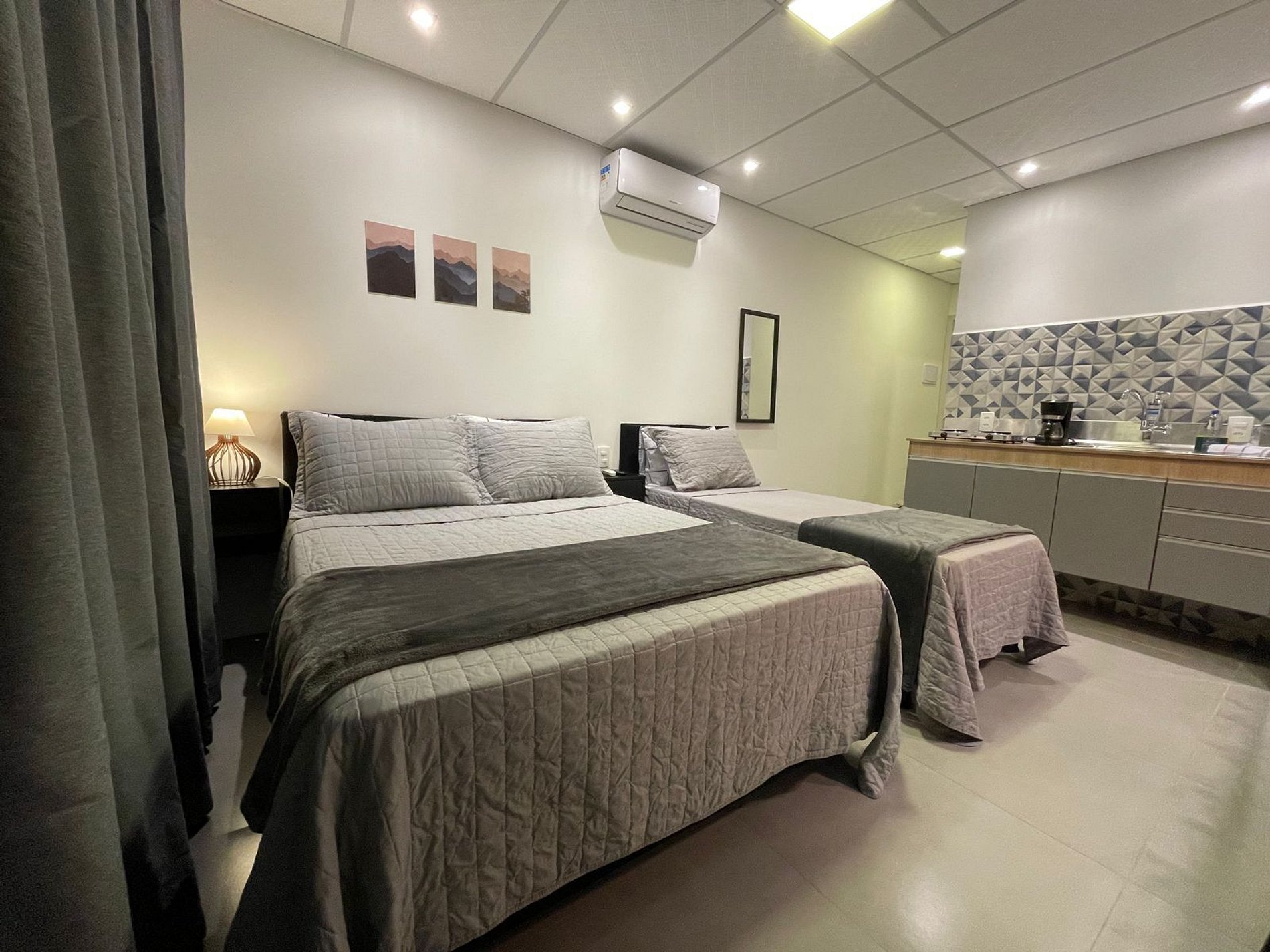 O Studio Urbano possui no quarto uma Cama Casal Padrão (138x188cm) e uma box solteiro (78x188cm), mesa de cabeceira com abajur, Ar Condicionado 12000 BTUs (frio/quente), armário tipo closet com cabides. A TV possui um Fire Tv Stick que permite acesso a serviços de streaming (Disney, Prime Video, etc) e aplicativos como o Youtube. Para seu conforto, o quarto ainda dispõe de lençol, fronha, travesseiros, cobre leito e manta plush.
