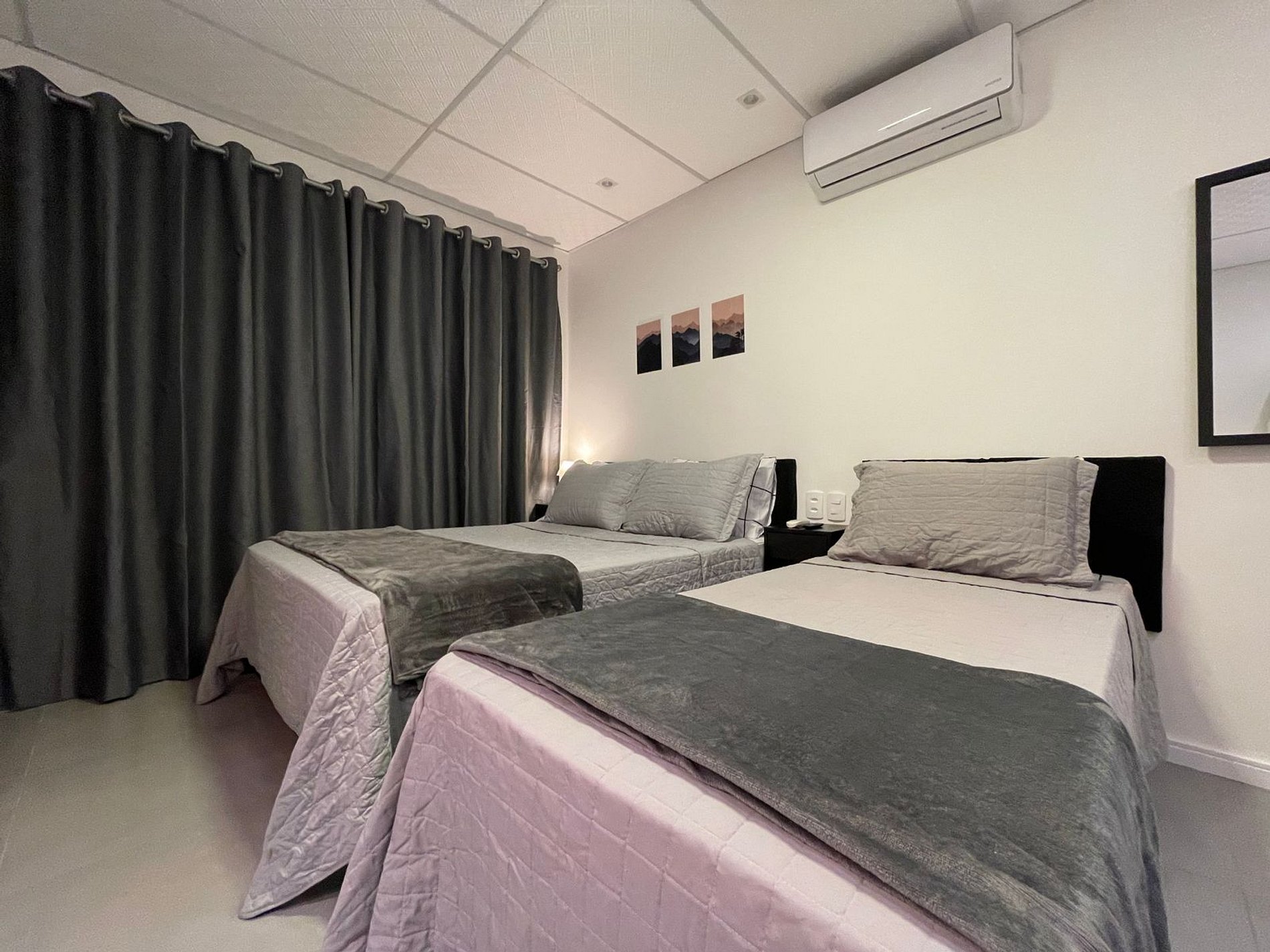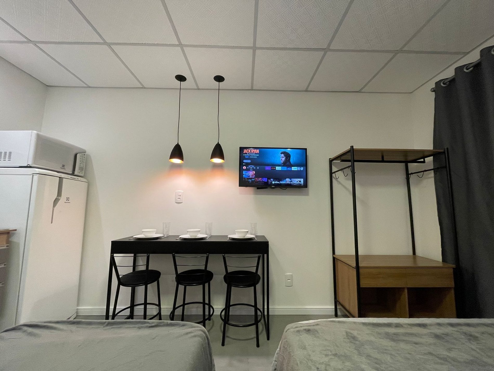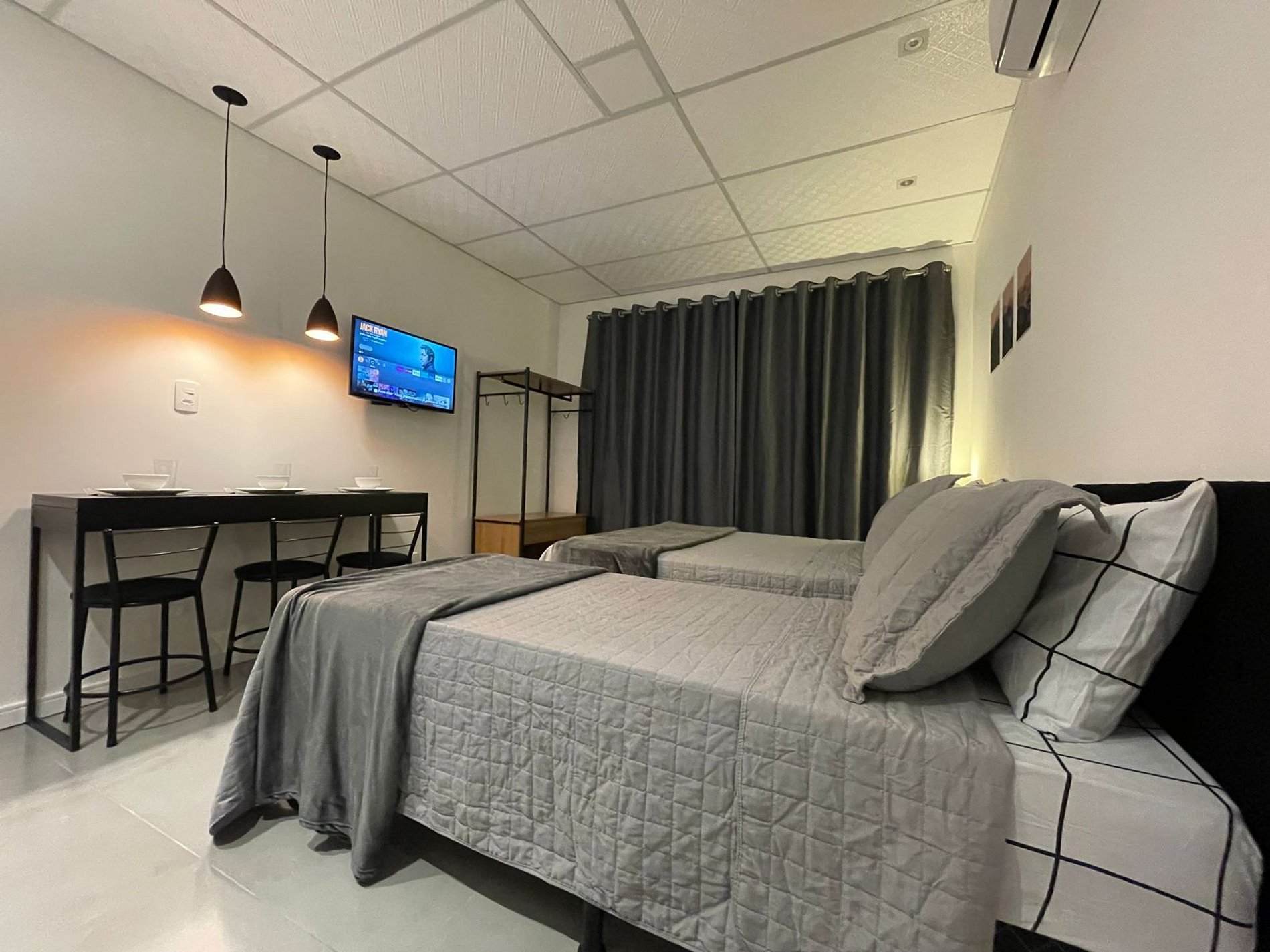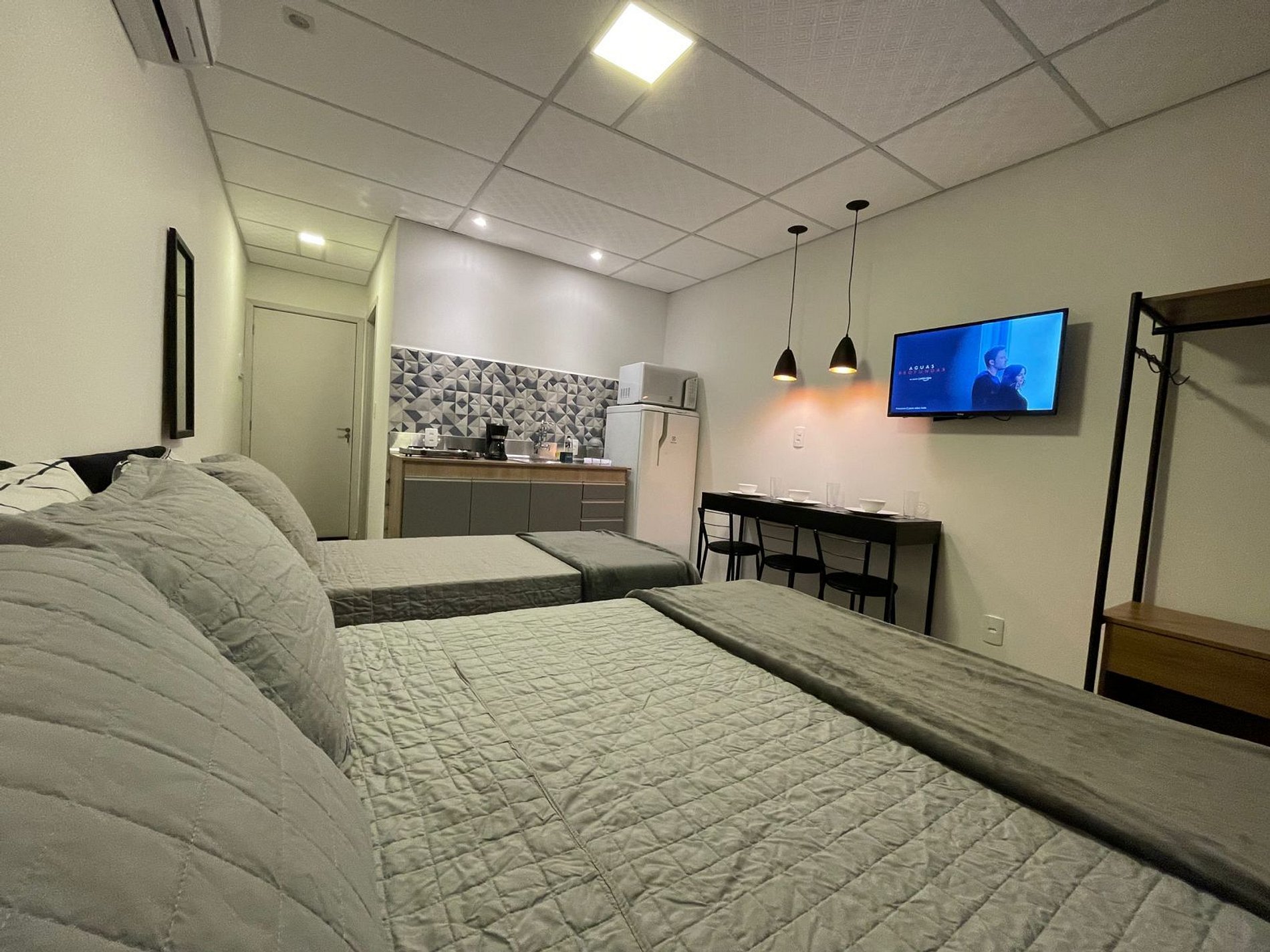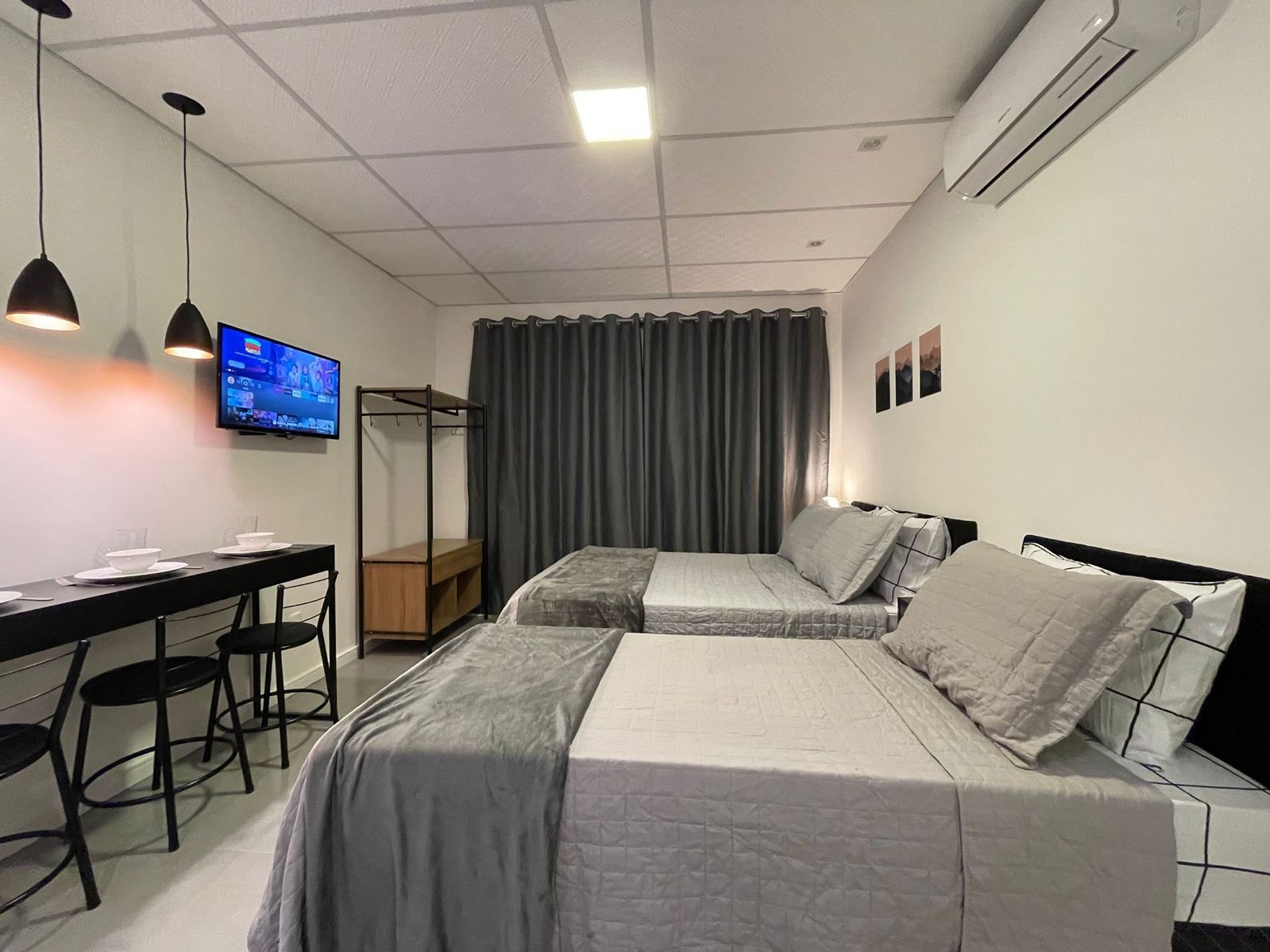 O Studio Urbano possui no quarto uma Cama Casal Padrão (138x188cm) e uma box solteiro (78x188cm), mesa de cabeceira com abajur, Ar Condicionado 12000 BTUs (frio/quente), armário tipo closet com cabides. A TV possui um Fire Tv Stick que permite acesso a serviços de streaming (Disney, Prime Video, etc) e aplicativos como o Youtube. Para seu conforto, o quarto ainda dispõe de lençol, fronha, travesseiros, cobre leito e manta plush.