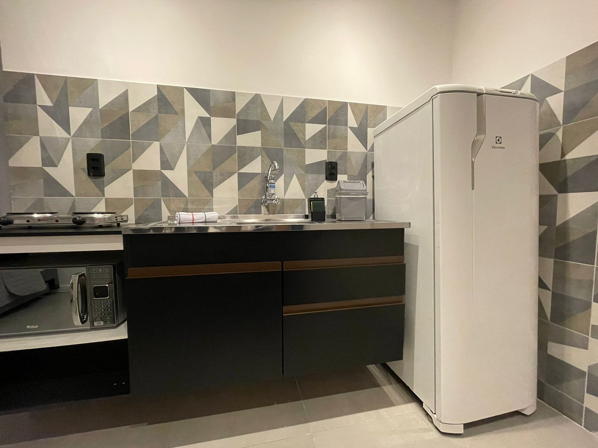 A cozinha conta com fogão elétrico, microondas, geladeira, cafeteira e demais utensílios para fazer suas refeições no local com tranquilidade. O banheiro é privativo e dispõe de toalhas de banho e rosto, bem como shampoo 2 em 1 e sabonetes como cortesia.