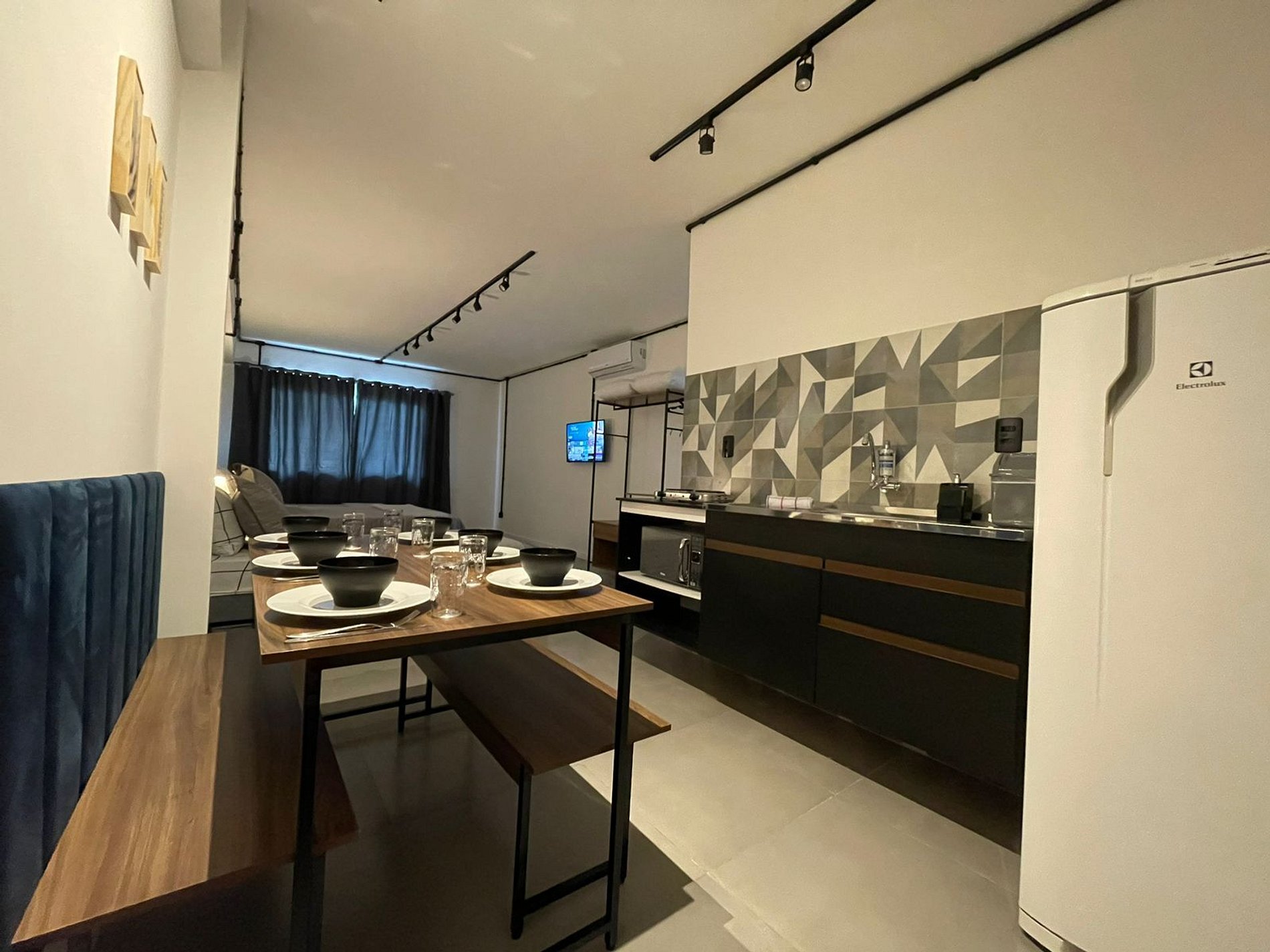 O Studio fica no andar térreo e o acesso é feito pelas escadas. A lavanderia é compartilhada e conta com máquina de lavar, secadora de roupas, tábua e ferro de passar.