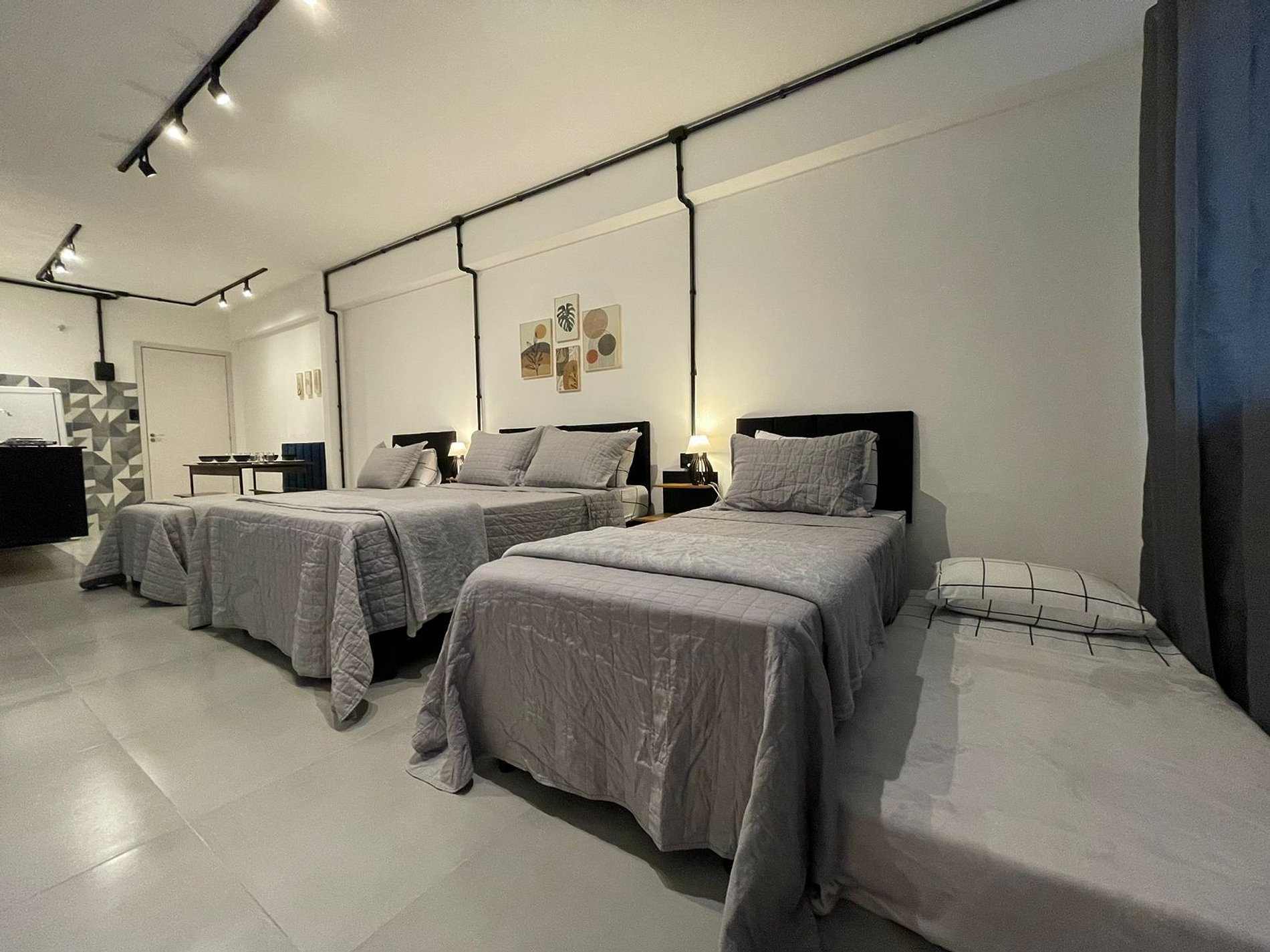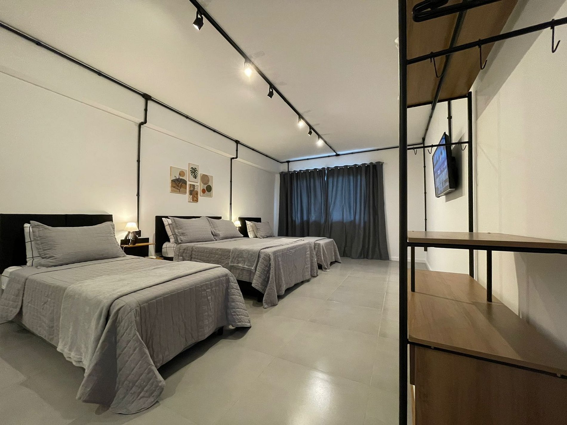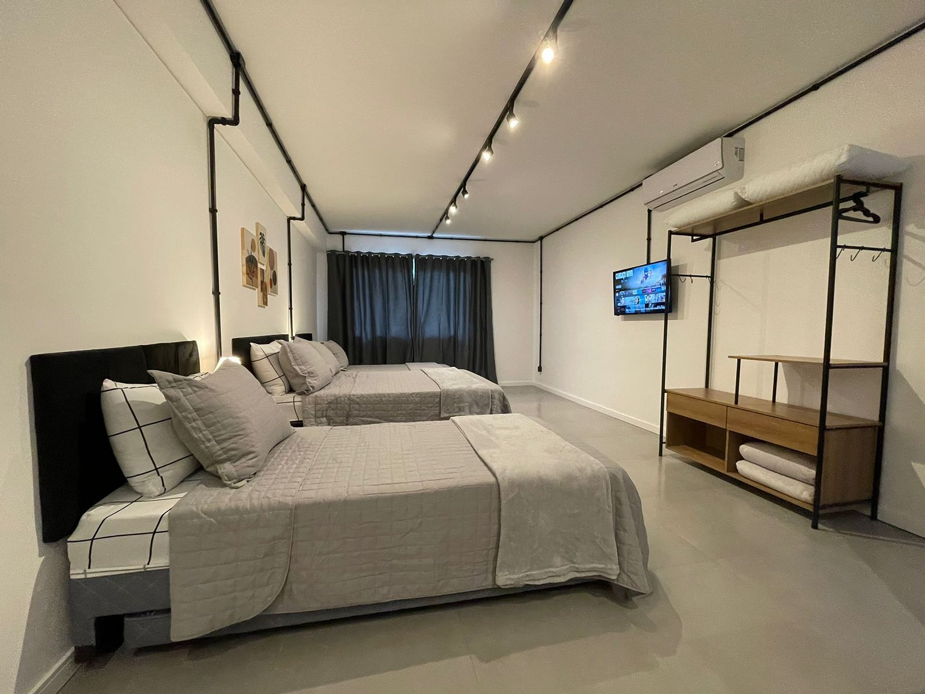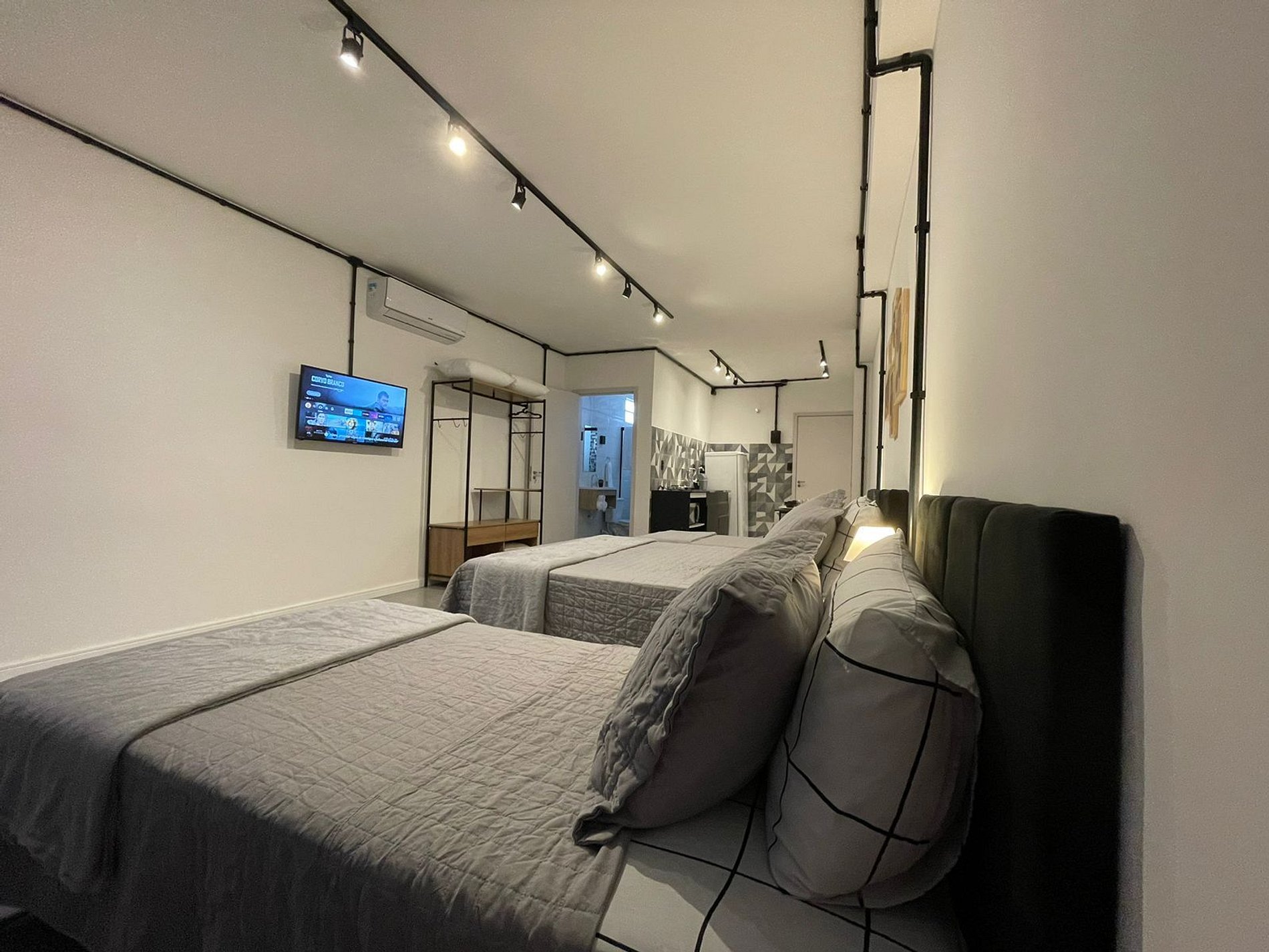 O Studio Industrial possui no quarto uma Cama Casal Padrão (138x188cm) e dois box solteiro (88x188cm) com cama auxiliar (77x171cm), mesas de cabeceira com abajures, Ar Condicionado 18000 BTUs (quente/frio), escrivaninha, armário tipo closet com cabides. A TV possui um Fire Tv Stick que permite acesso a serviços de streaming (Disney, Prime Video, etc) e aplicativos como o Youtube. Para seu conforto, o quarto ainda dispõe de lençol, fronha, travesseiros, cobre leito e manta plush.