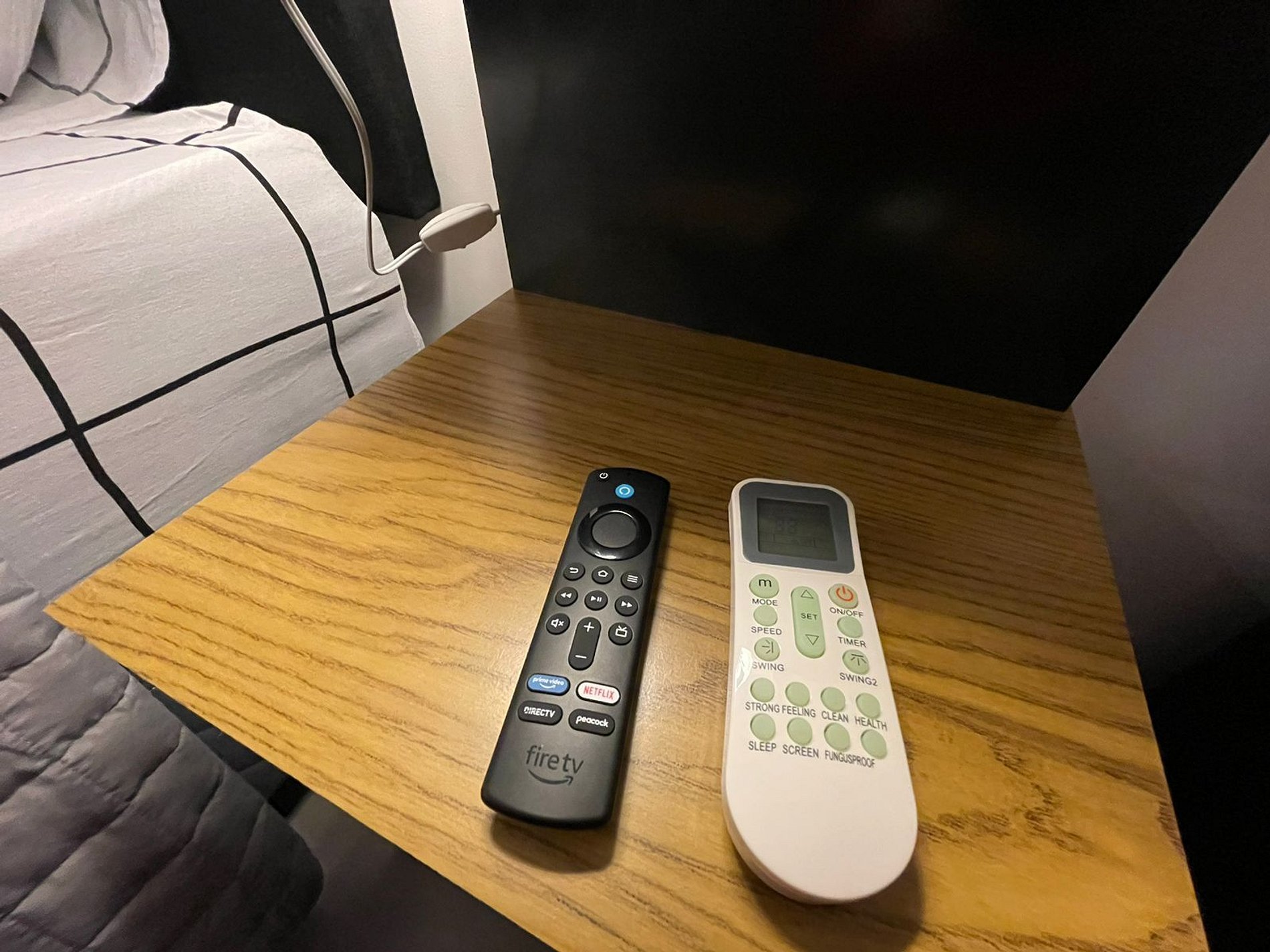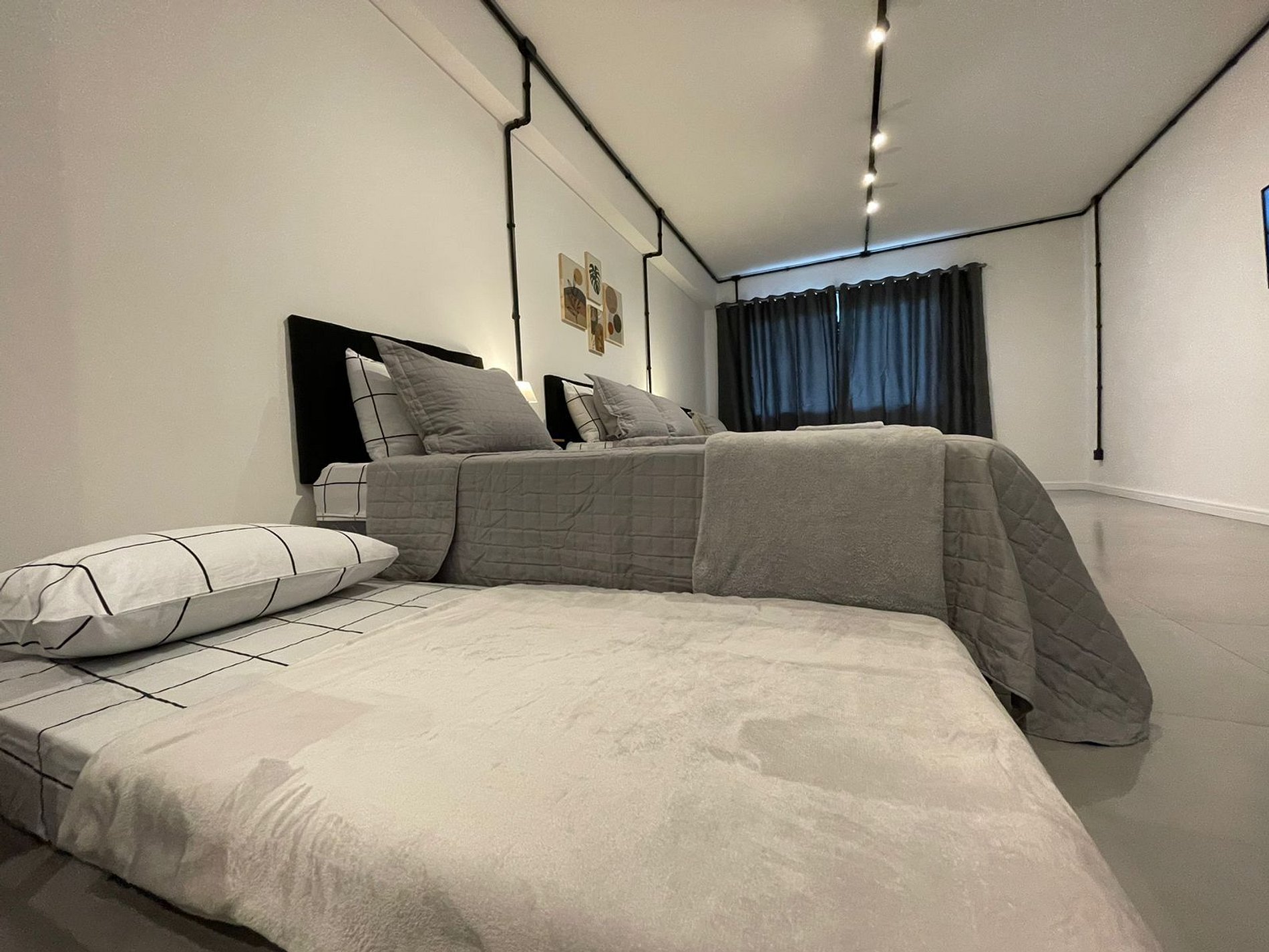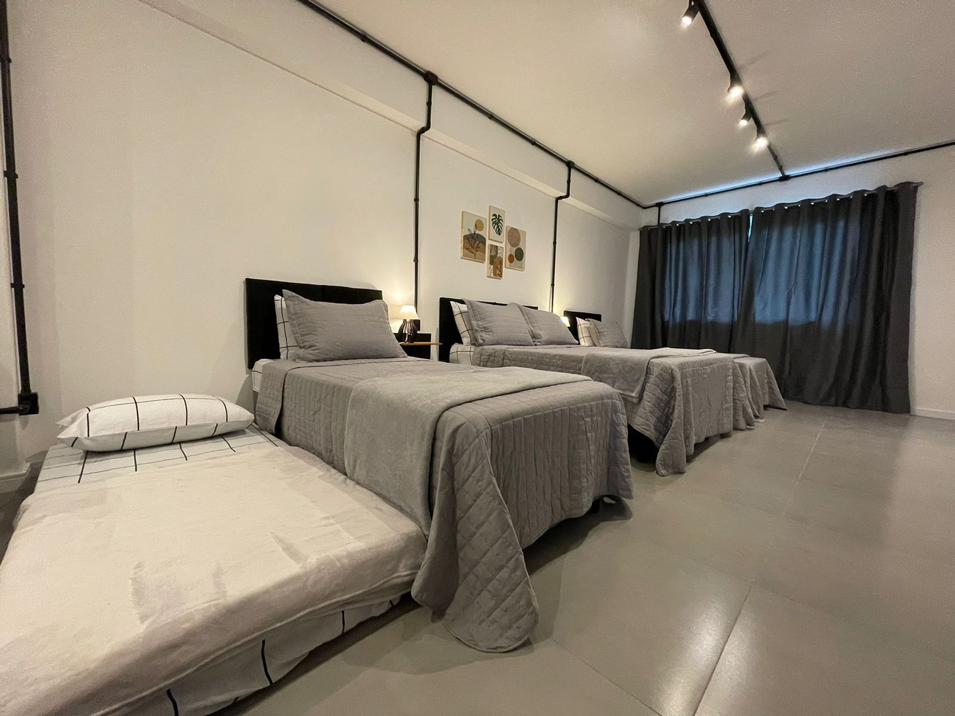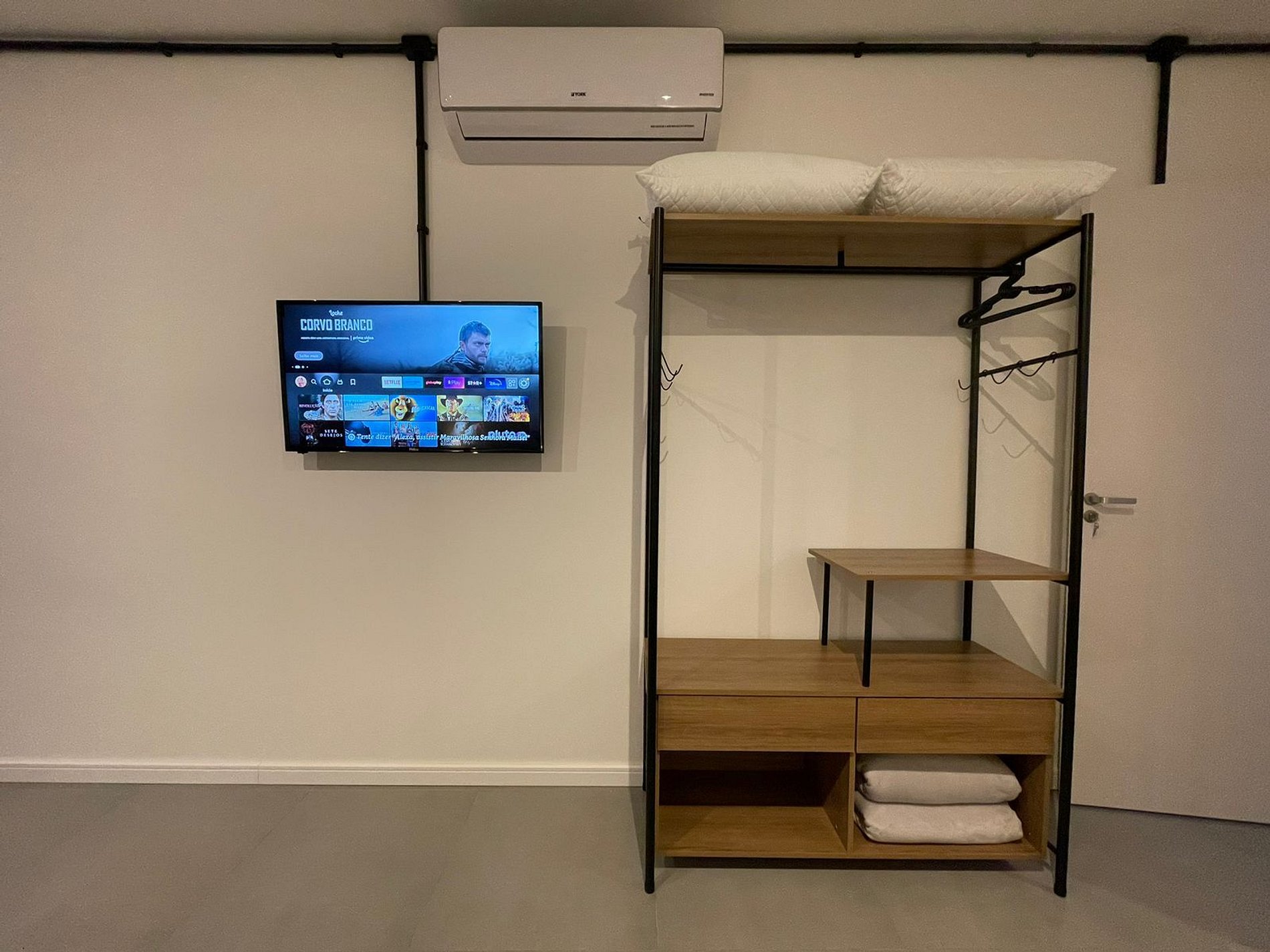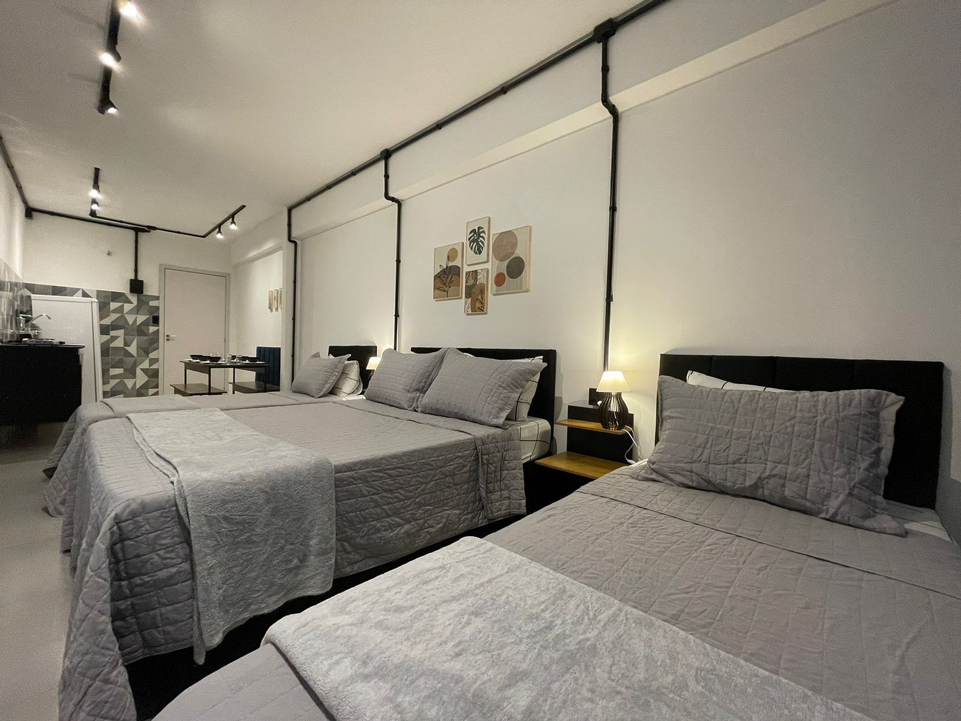 O Studio Industrial possui no quarto uma Cama Casal Padrão (138x188cm) e dois box solteiro (88x188cm) com cama auxiliar (77x171cm), mesas de cabeceira com abajures, Ar Condicionado 18000 BTUs (quente/frio), escrivaninha, armário tipo closet com cabides. A TV possui um Fire Tv Stick que permite acesso a serviços de streaming (Disney, Prime Video, etc) e aplicativos como o Youtube. Para seu conforto, o quarto ainda dispõe de lençol, fronha, travesseiros, cobre leito e manta plush.
