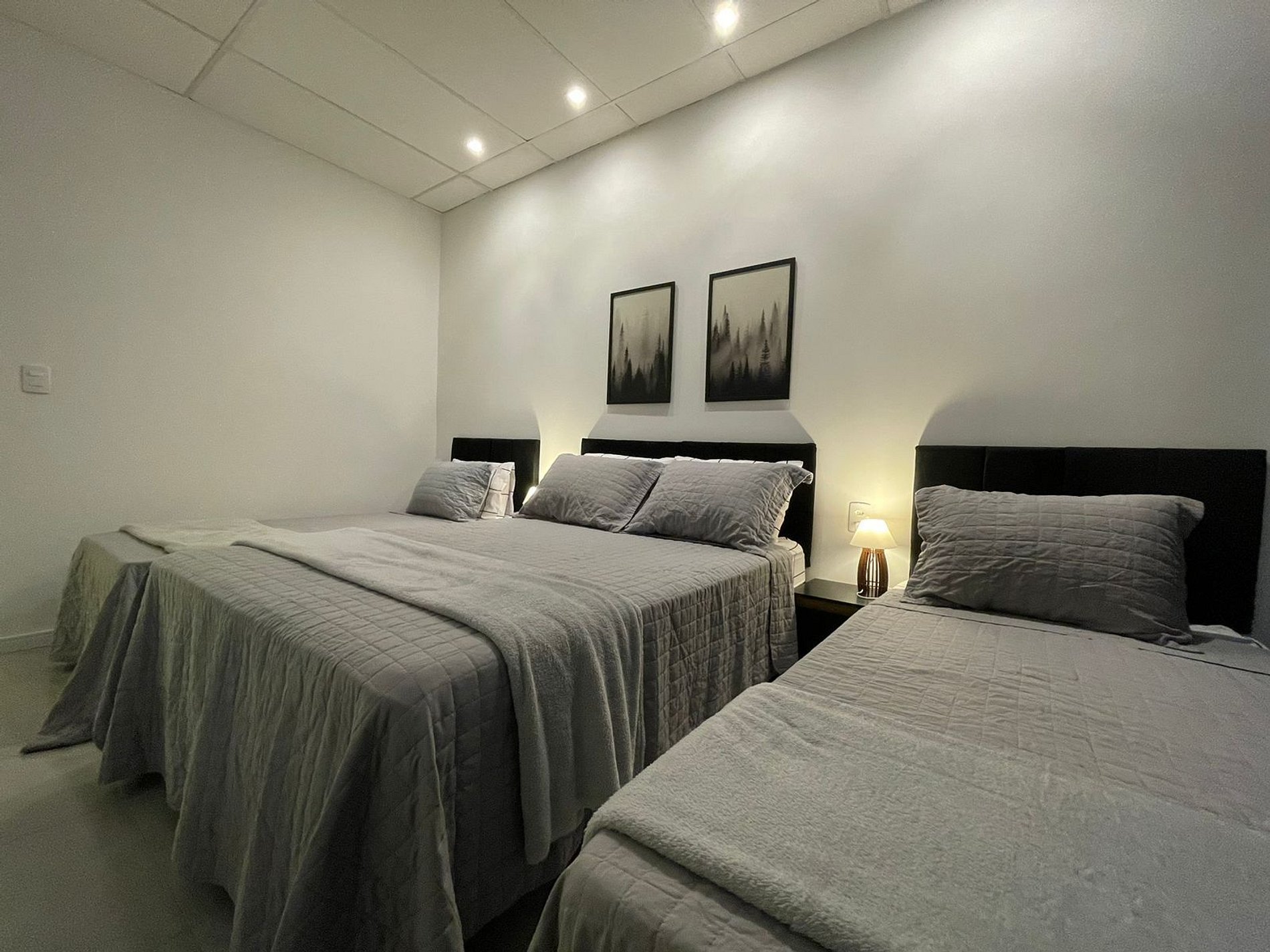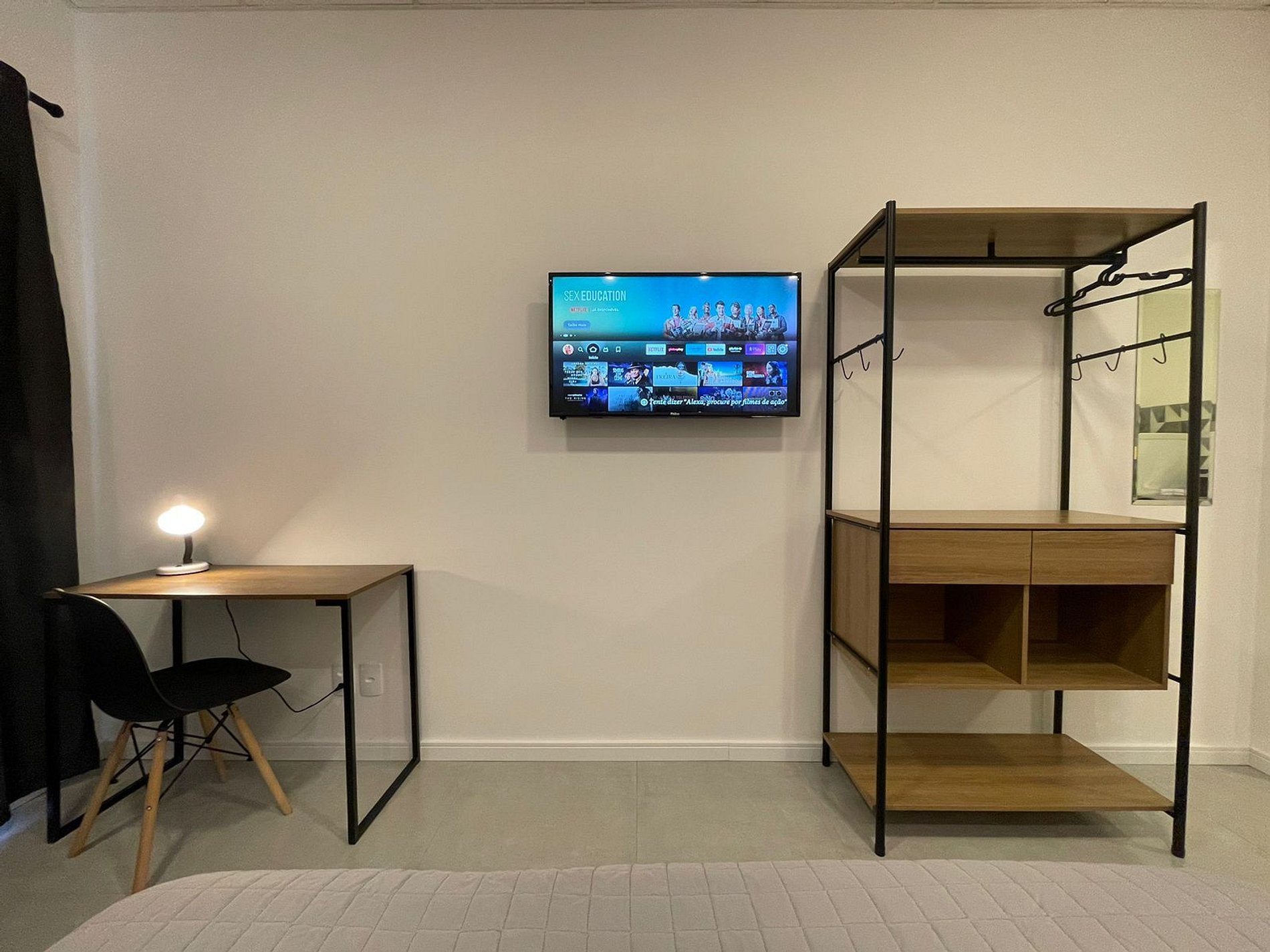 O Studio possui no quarto uma Cama Casal Padrão (138x188cm) e duas box solteiro (88x188cm), mesas de cabeceira com abajures, Ar Condicionado 12000 BTUs (frio/quente), armário tipo closet com cabides. A TV possui um Fire Tv Stick que permite acesso a serviços de streaming (Disney, Prime Video, etc) e aplicativos como o Youtube. Para seu conforto, o quarto ainda dispõe de lençol, fronha, travesseiros, cobre leito e manta plush.