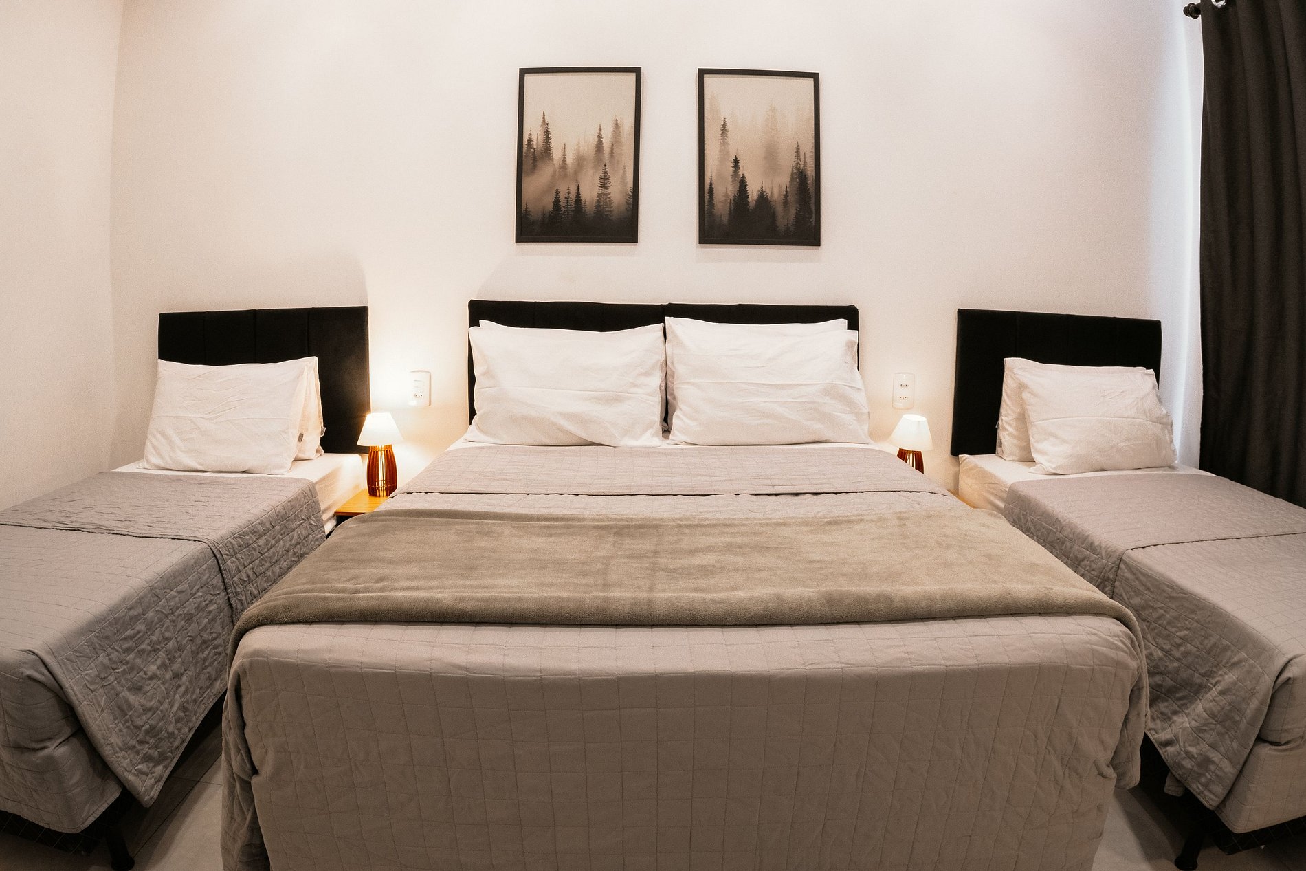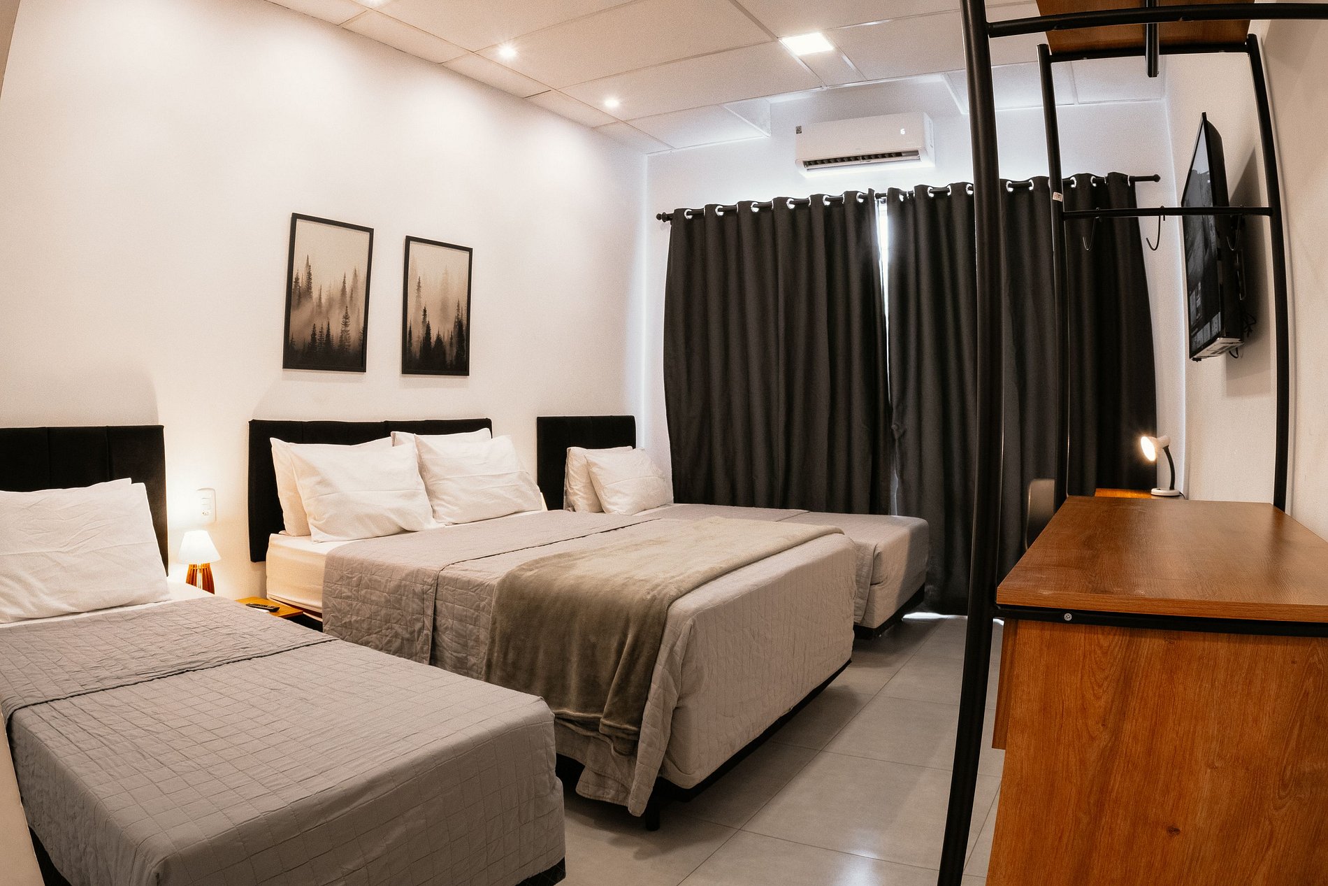 O studio é completo, aconchegante e funcional. Conta com uma cama de casal padrão e duas camas box de solteiro, acomodando confortavelmente até 4 pessoas. O ambiente dispõe de ar-condicionado quente e frio, Wi-Fi, Smart TV com Fire TV Stick (acesso a streaming como Prime Video, Disney+ e YouTube), além de mesas de cabeceira com abajures e armário estilo closet com cabides.