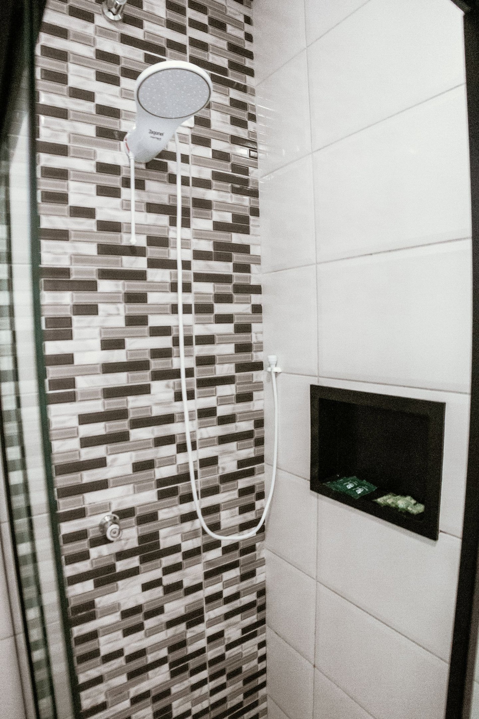 O banheiro é privativo e conta com toalhas de banho e rosto, além de shampoo 2 em 1 e sabonetes como cortesia.
