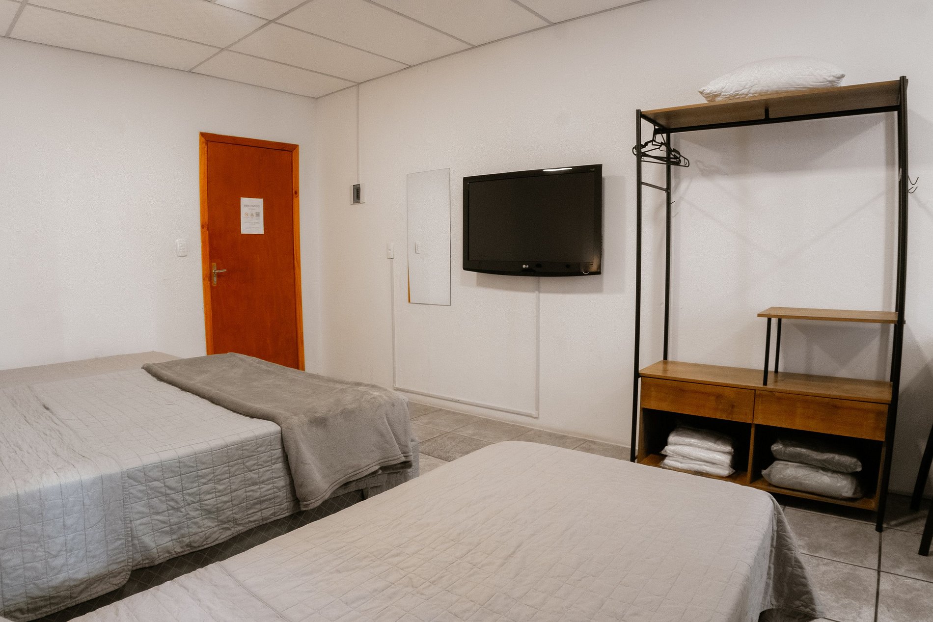O studio é completo, aconchegante e funcional. Conta com uma cama de casal padrão e duas camas box de solteiro, acomodando confortavelmente até 4 pessoas. O ambiente dispõe de ar-condicionado quente e frio, Wi-Fi, Smart TV com Fire TV Stick (acesso a streaming como Prime Video, Disney+ e YouTube), além de mesas de cabeceira com abajures e armário estilo closet com cabides.