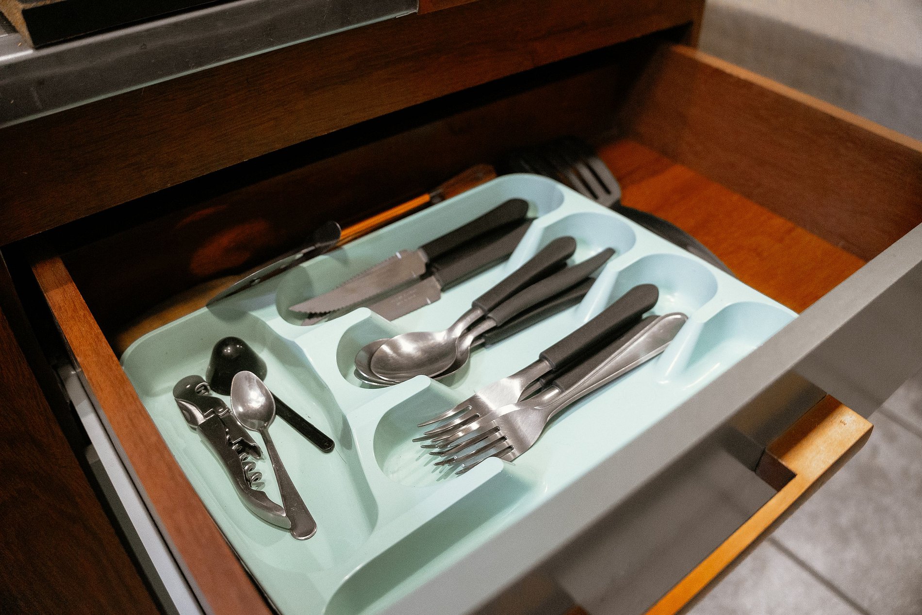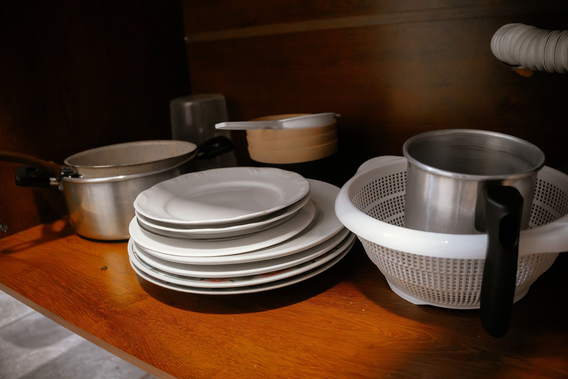 A cozinha é equipada com fogão elétrico, micro-ondas, geladeira, cafeteira e utensílios essenciais para o preparo de refeições. O espaço também oferece roupa de cama completa, incluindo lençóis, fronhas, travesseiros, cobre-leito e manta plush.