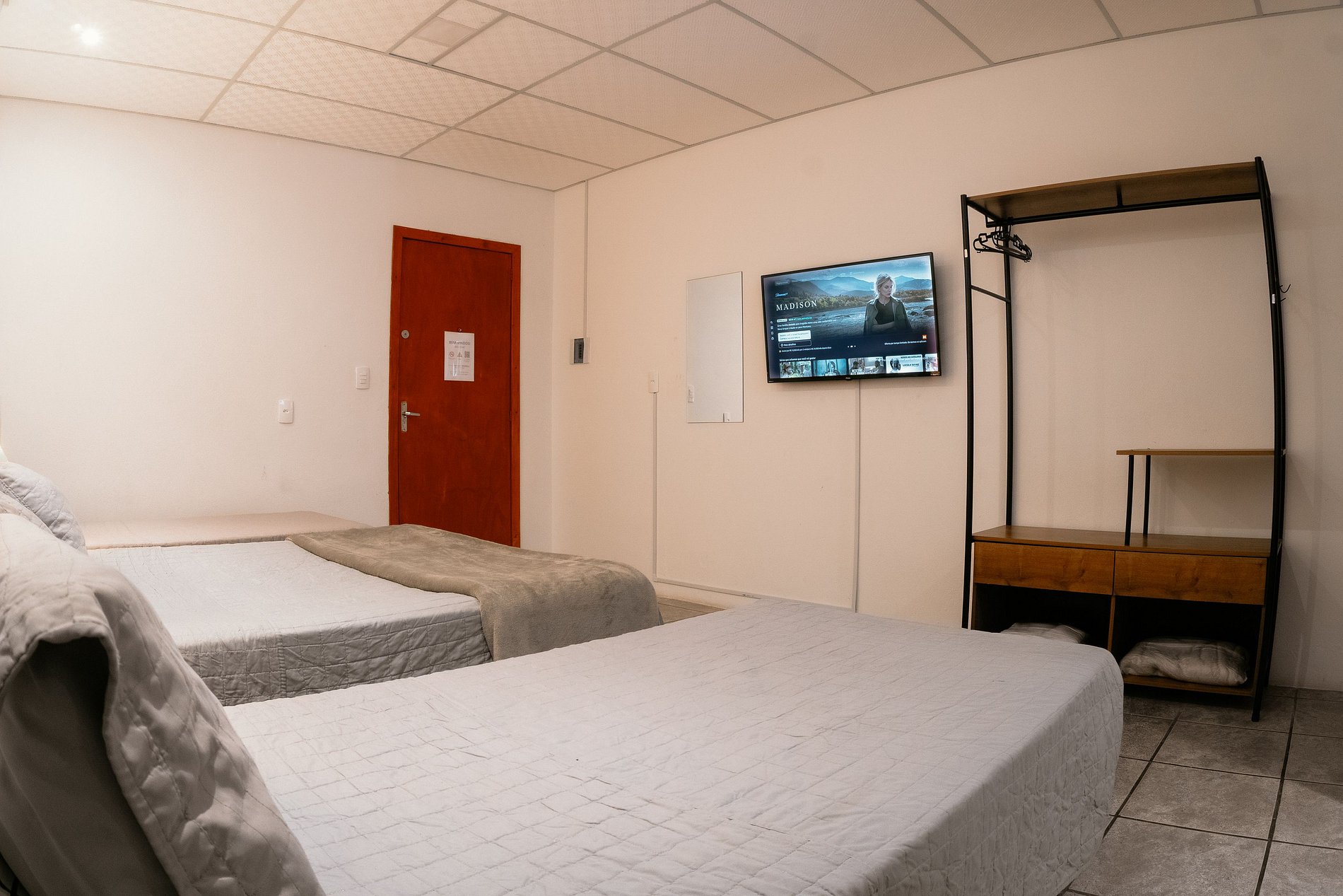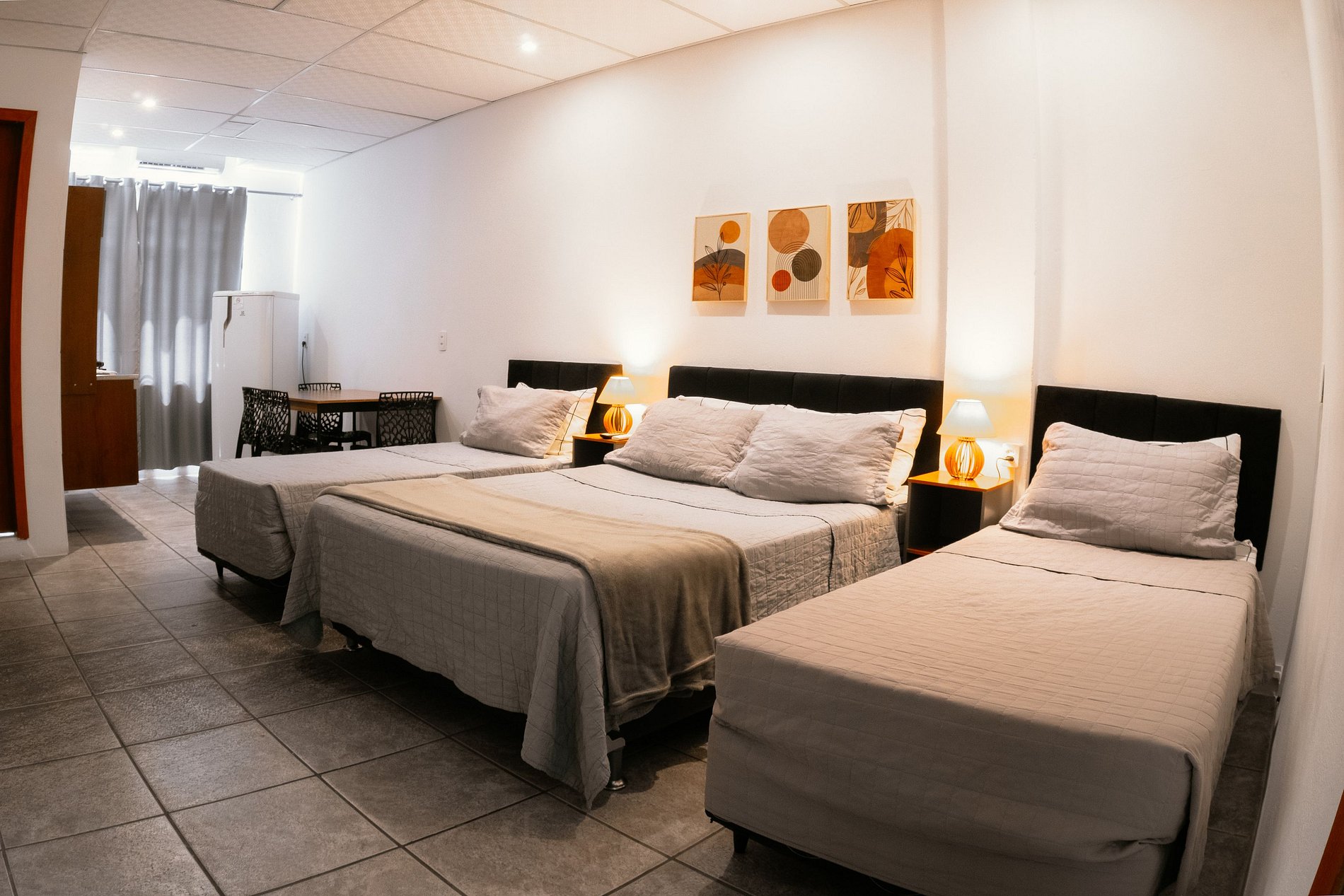 O studio é completo, aconchegante e funcional. Conta com uma cama de casal padrão e duas camas box de solteiro, acomodando confortavelmente até 4 pessoas. O ambiente dispõe de ar-condicionado quente e frio, Wi-Fi, Smart TV com Fire TV Stick (acesso a streaming como Prime Video, Disney+ e YouTube), além de mesas de cabeceira com abajures e armário estilo closet com cabides.