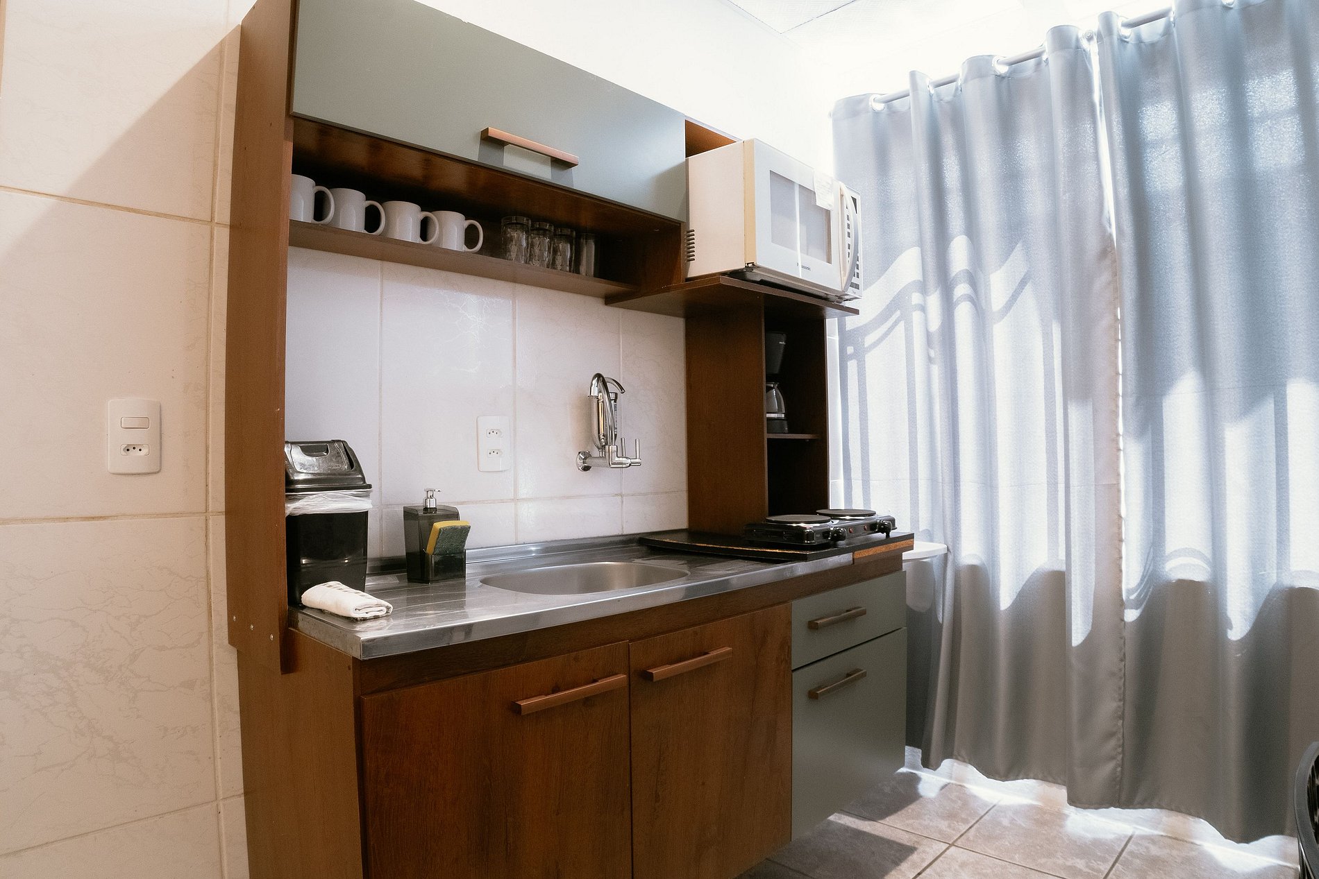A cozinha é equipada com fogão elétrico, micro-ondas, geladeira, cafeteira e utensílios essenciais para o preparo de refeições. O espaço também oferece roupa de cama completa, incluindo lençóis, fronhas, travesseiros, cobre-leito e manta plush.