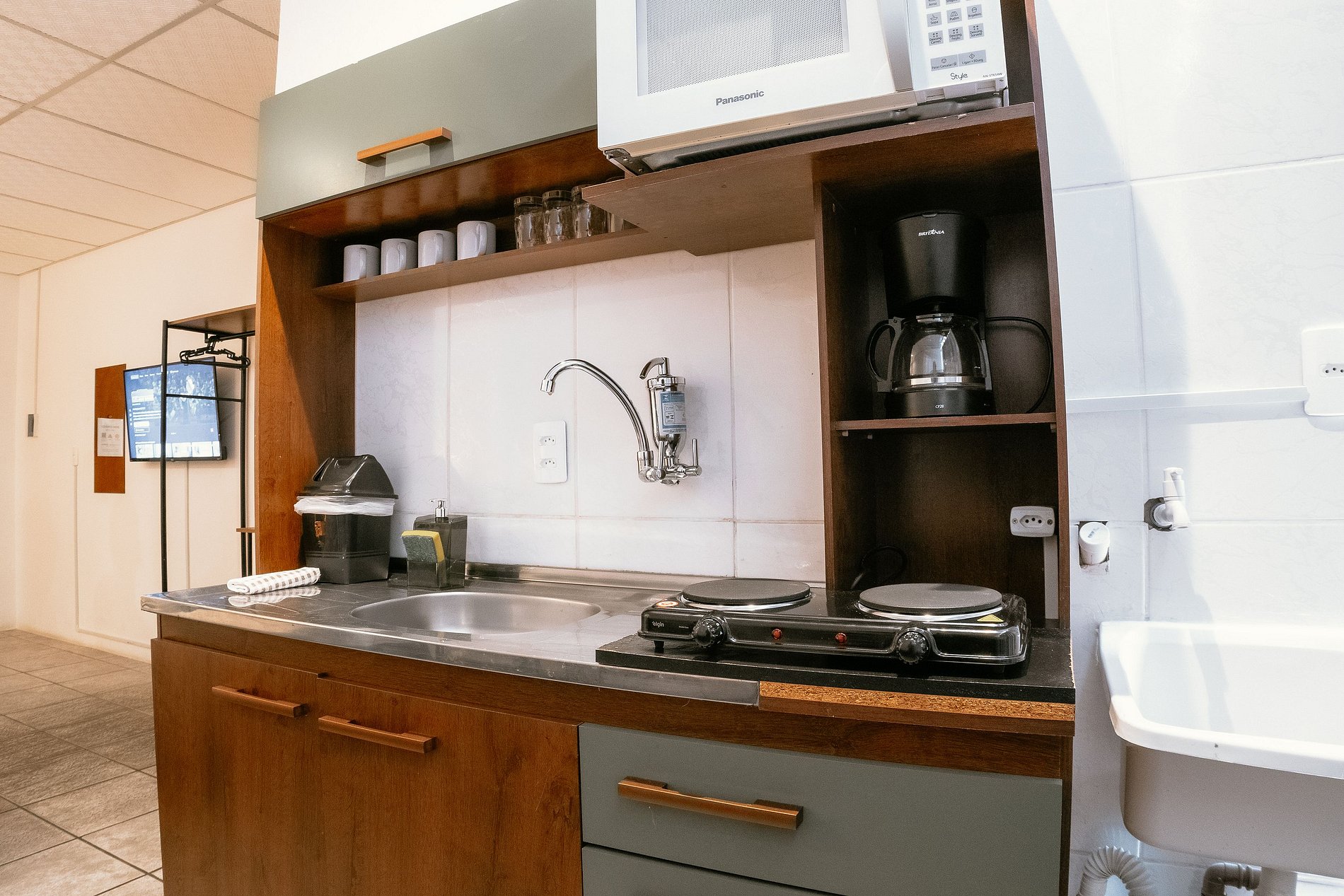 Abrace a simplicidade neste lugar calmo e bem localizado. O Studio é muito bem equipado para até 4 pessoas, com 1 cama de casal padrão e 2 box solteiro. A cozinha conta com fogão elétrico, microondas, geladeira, cafeteira e demais utensílios para fazer suas refeições no local com tranquilidade. O banheiro é privativo e dispõe de toalhas de banho e rosto, bem como shampoo e sabonetes como cortesia. O Studio fica no 1o andar. Wi-fi incluído. Estacionamento gratuito. Recepção e conveniência.